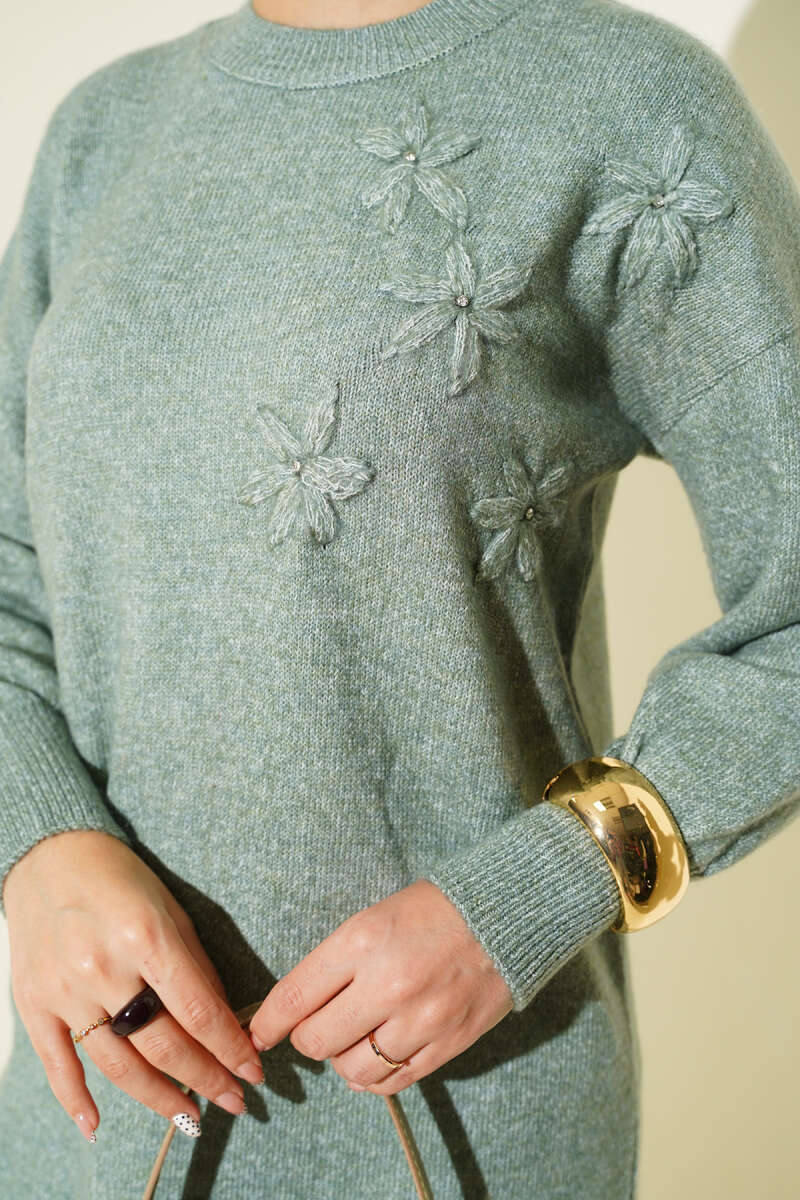 Yaka Çiçekli Yumoş Triko Tunik Yağ Yeşili