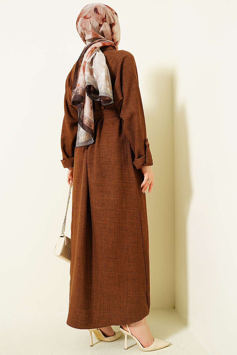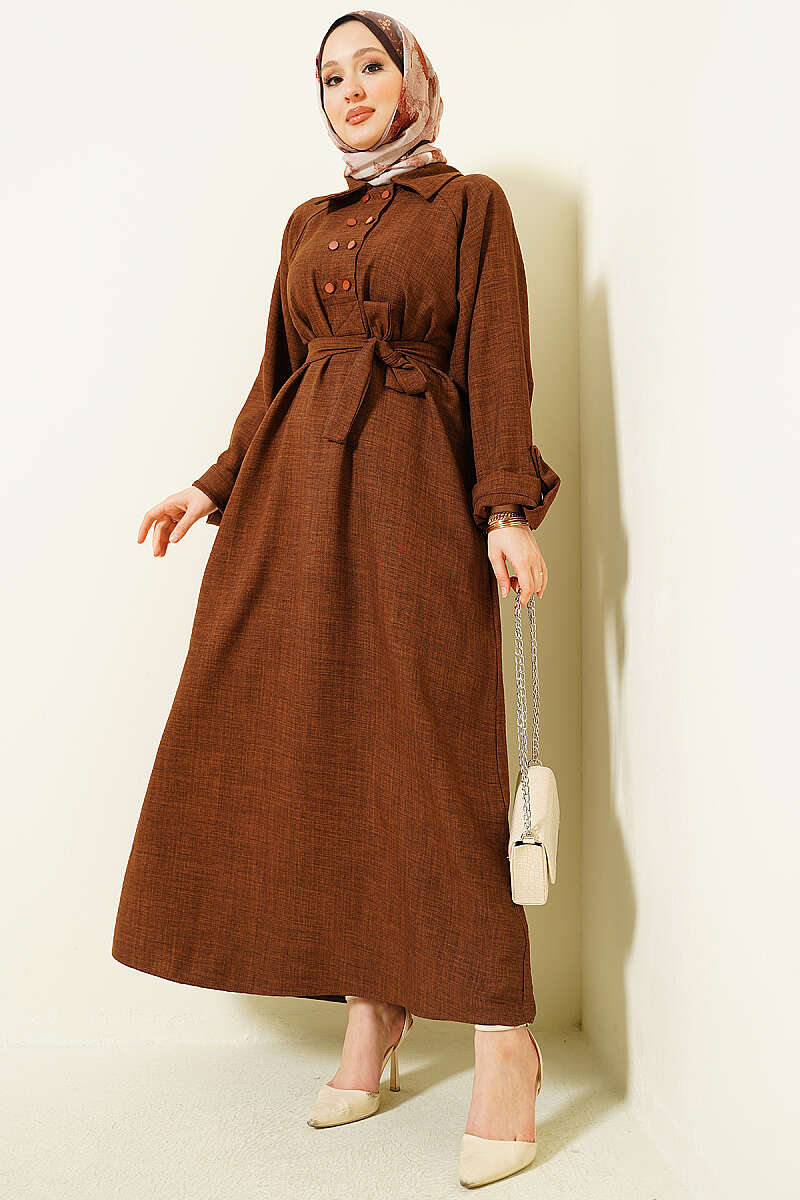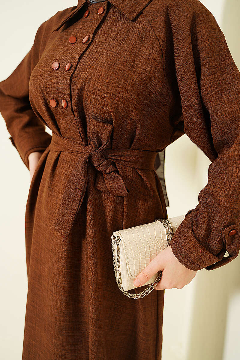 Yaka Çift Düğmeli Elbise Kahve