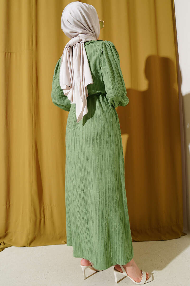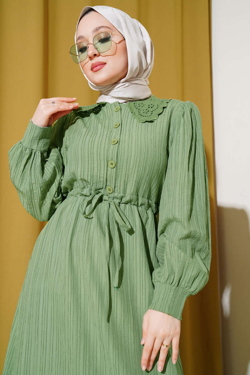 Yaka Dantelli Bel Tünelli Elbise Çağla Yeşili