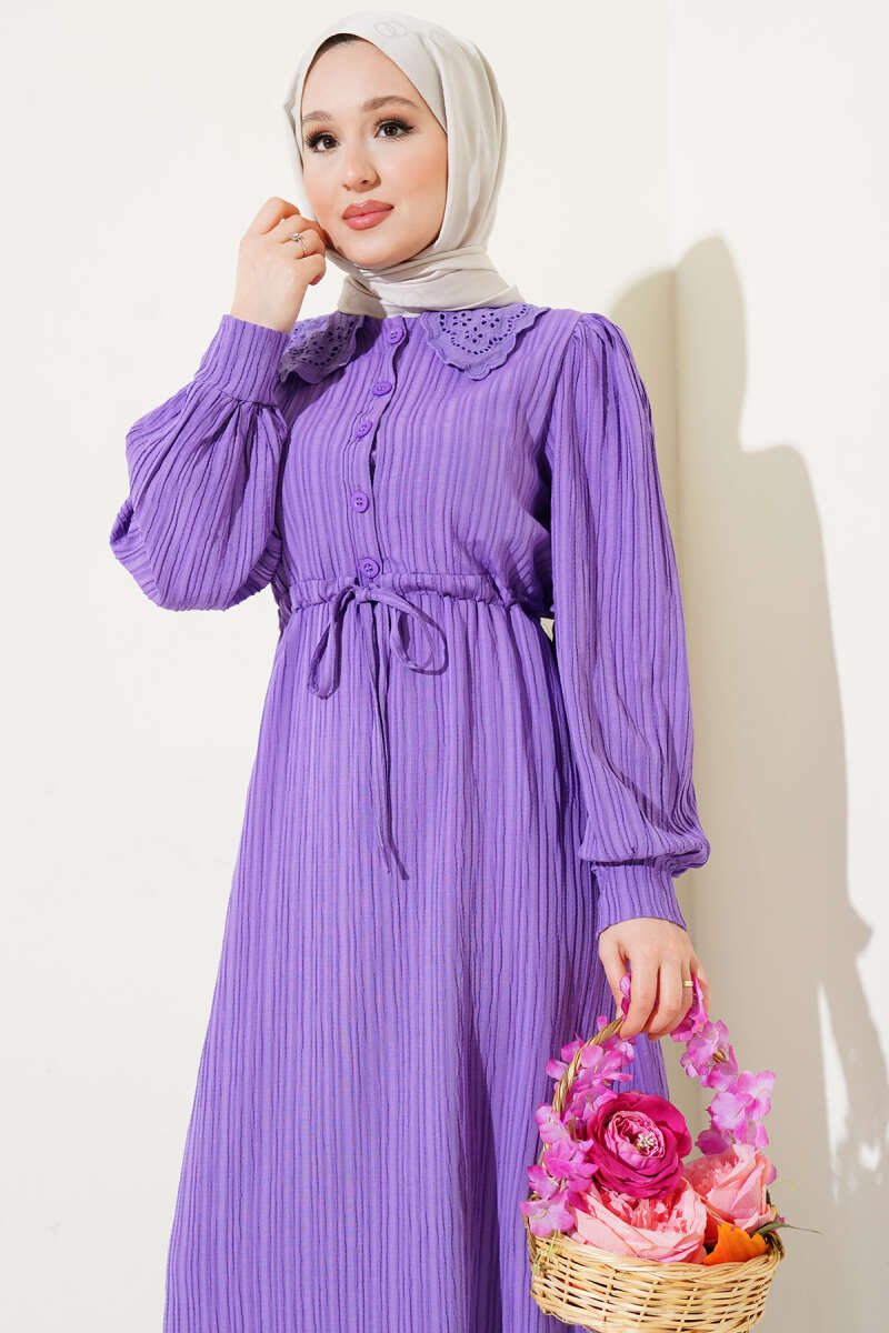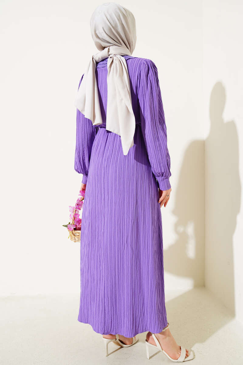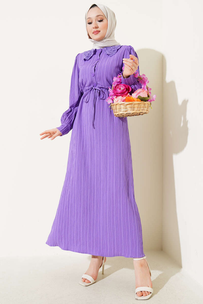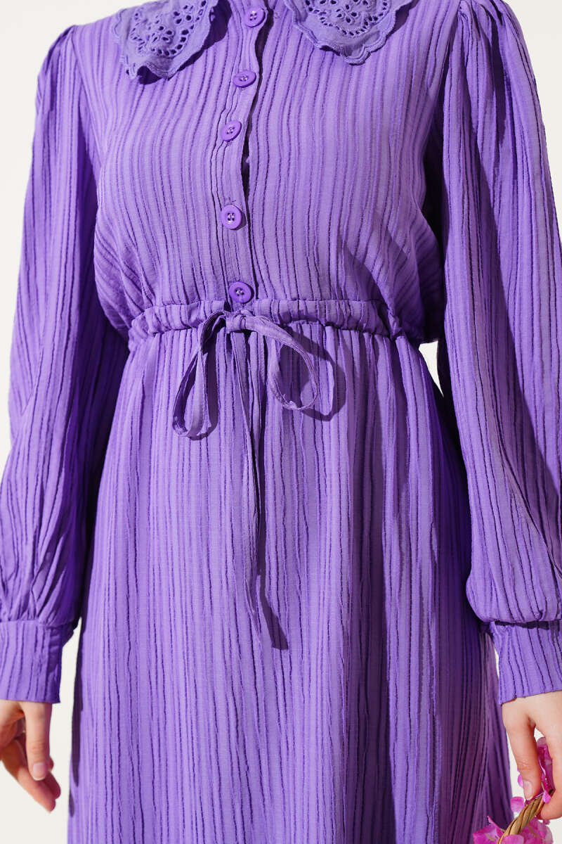 Yaka Dantelli Bel Tünelli Elbise Lila