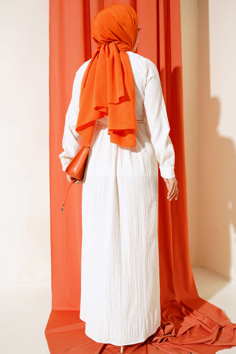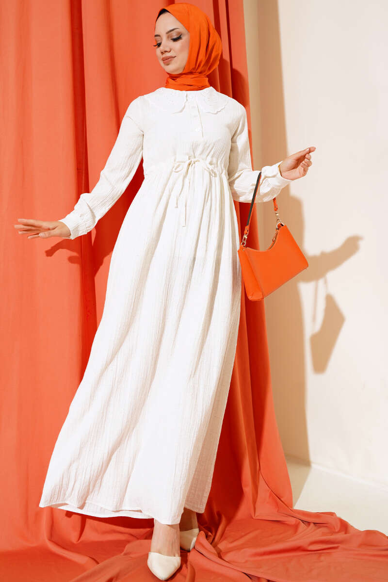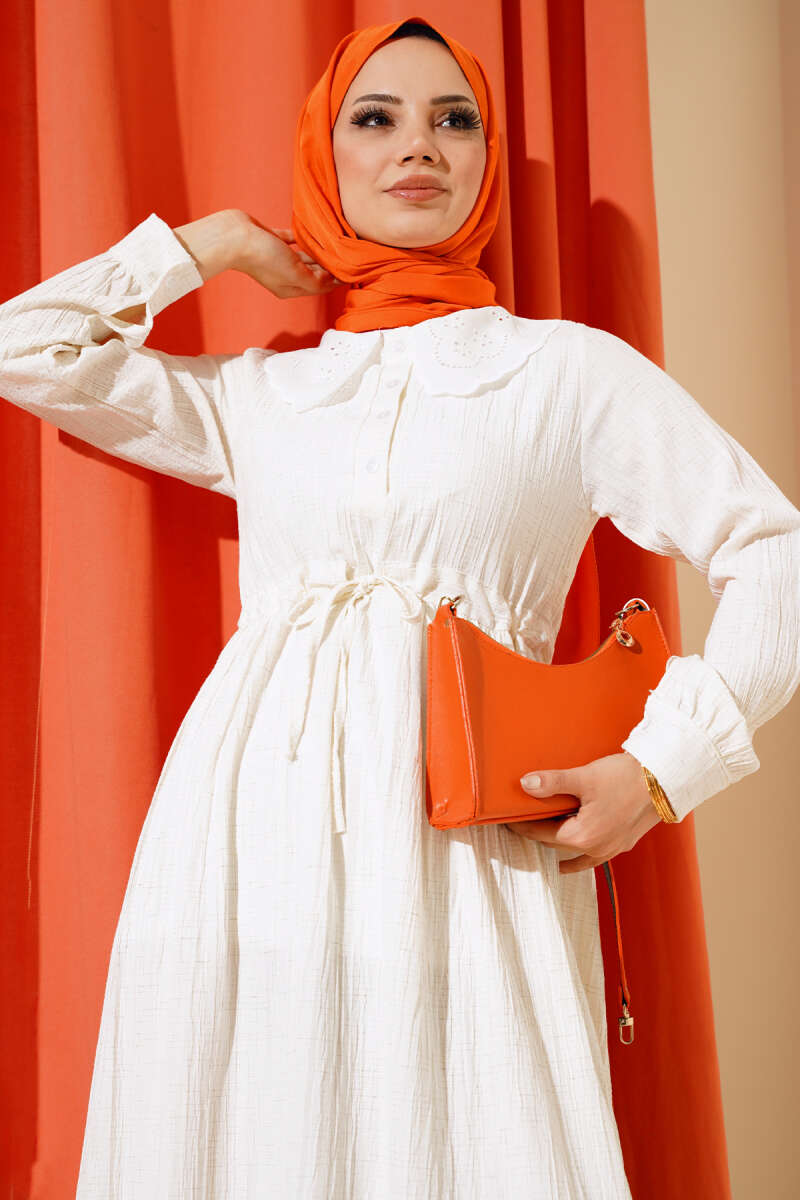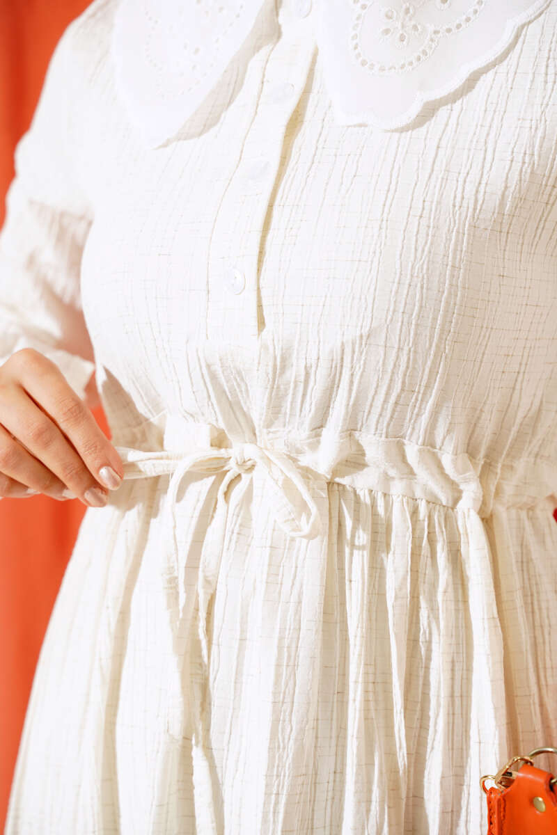Yaka Dantelli Yarım Düğmeli Elbise Ekru