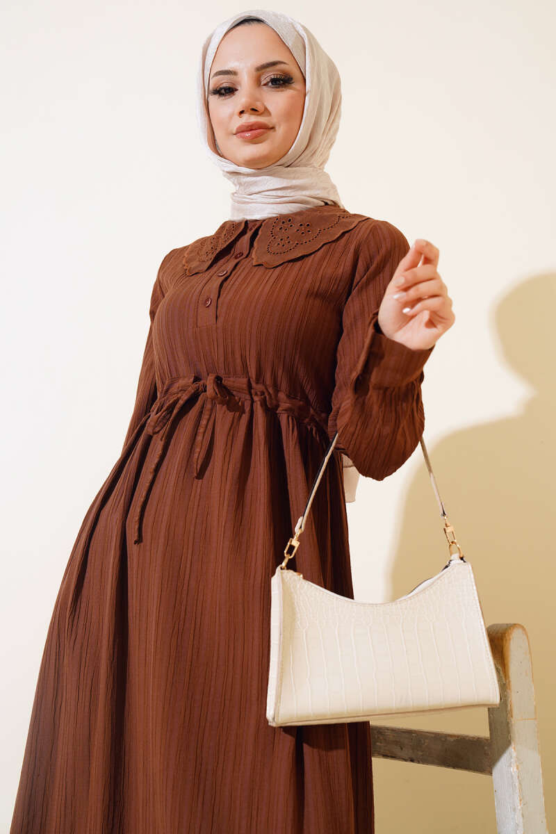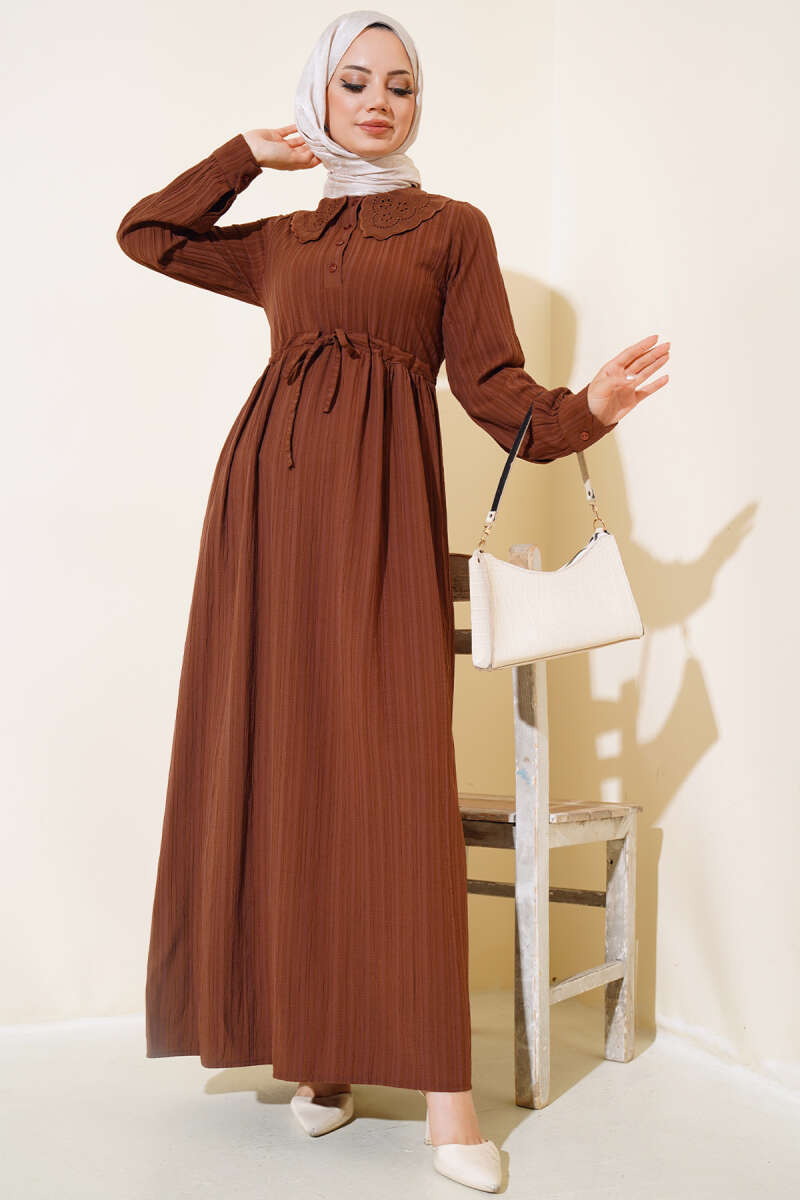 Yaka Dantelli Yarım Düğmeli Elbise Kahve