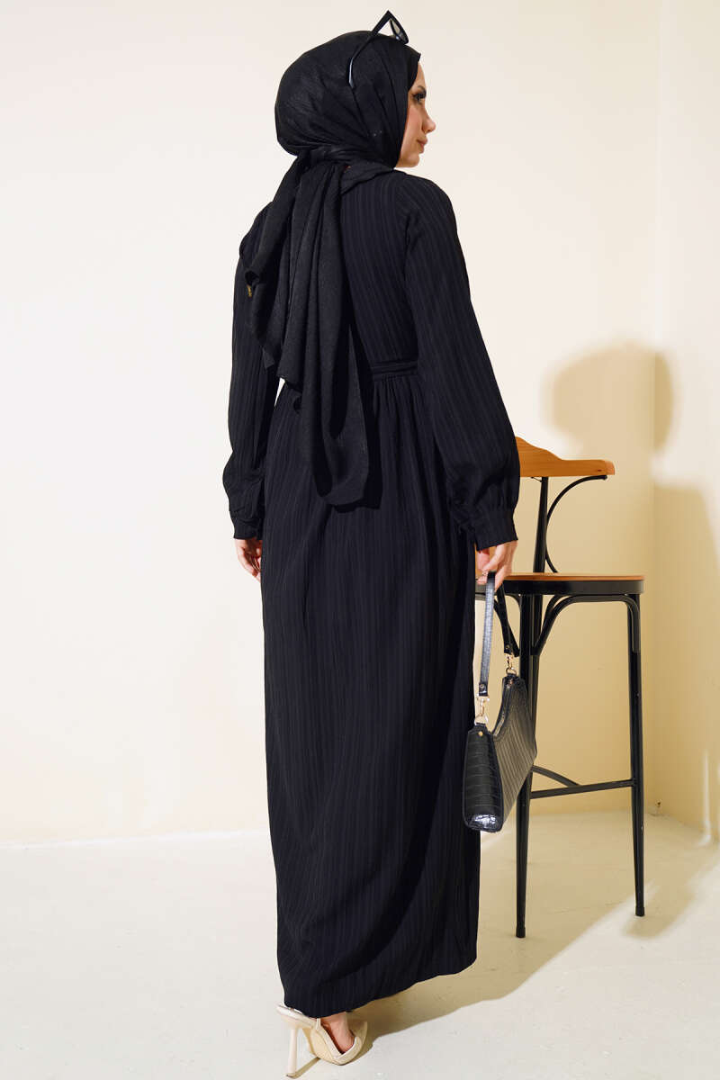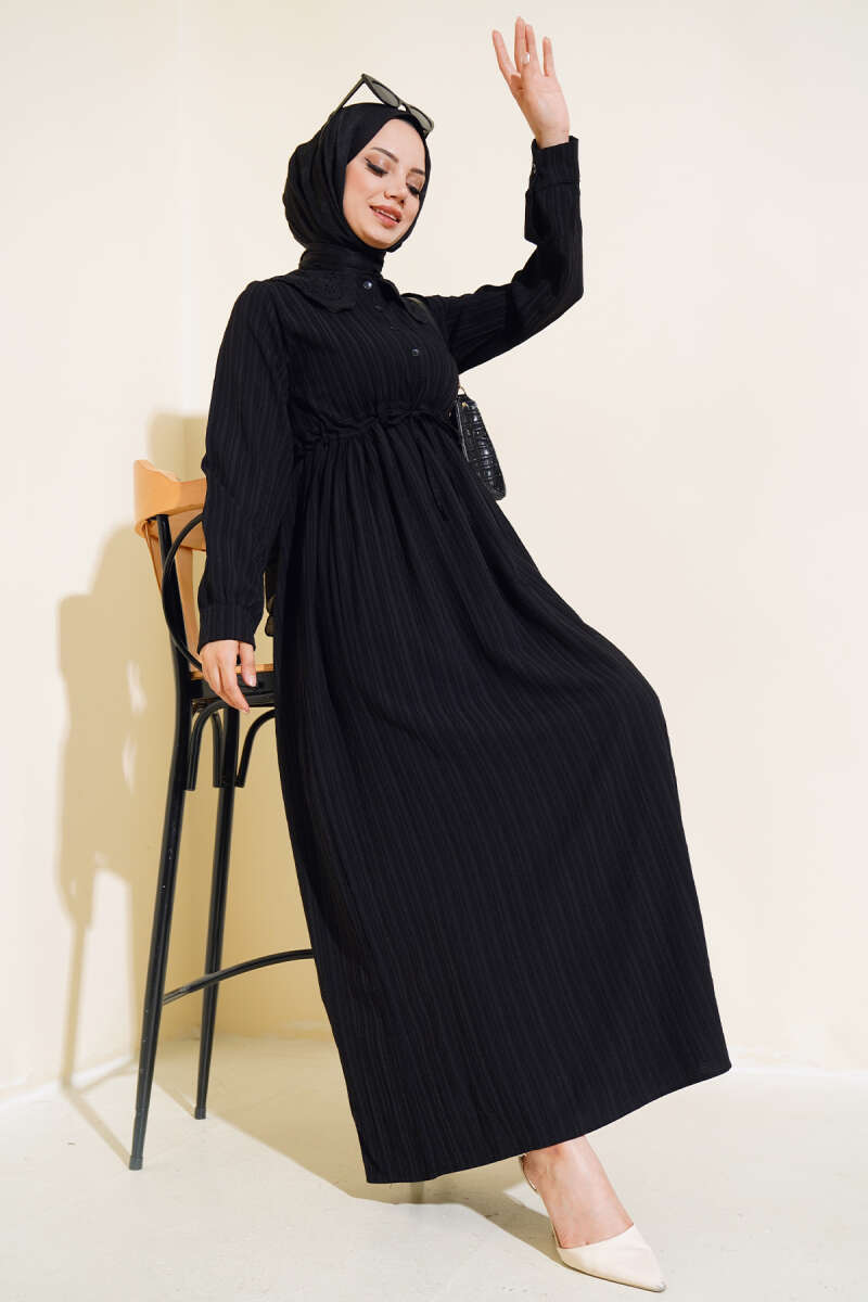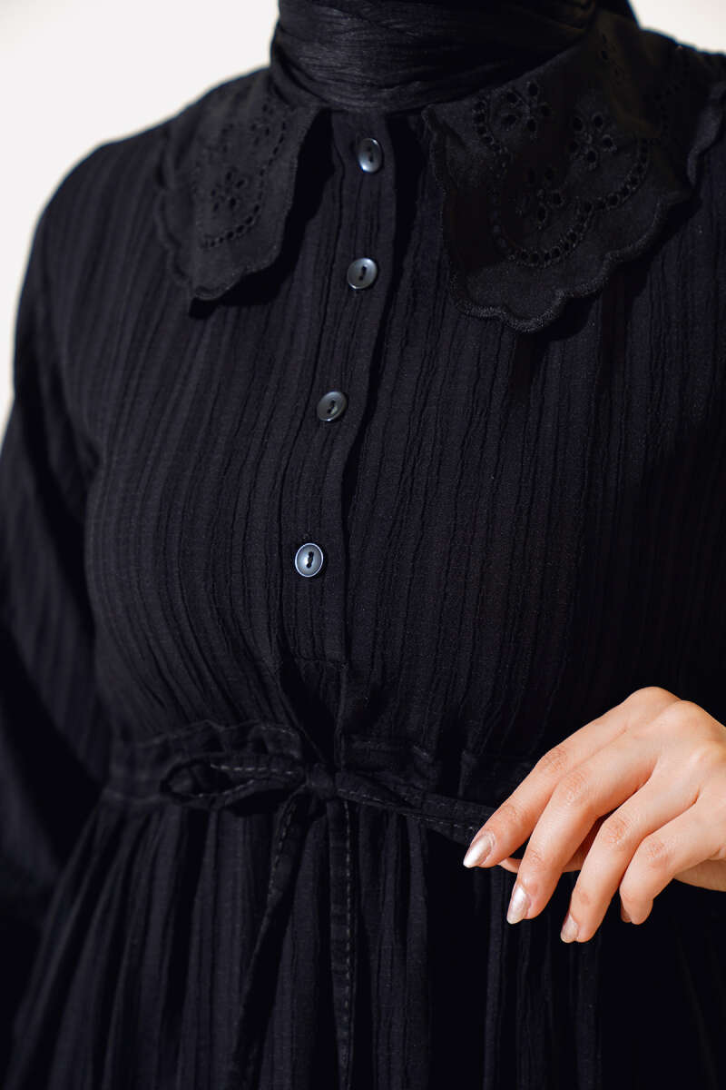 Yaka Dantelli Yarım Düğmeli Elbise Siyah