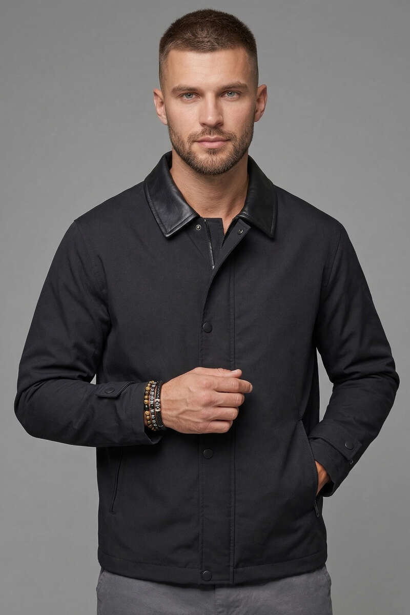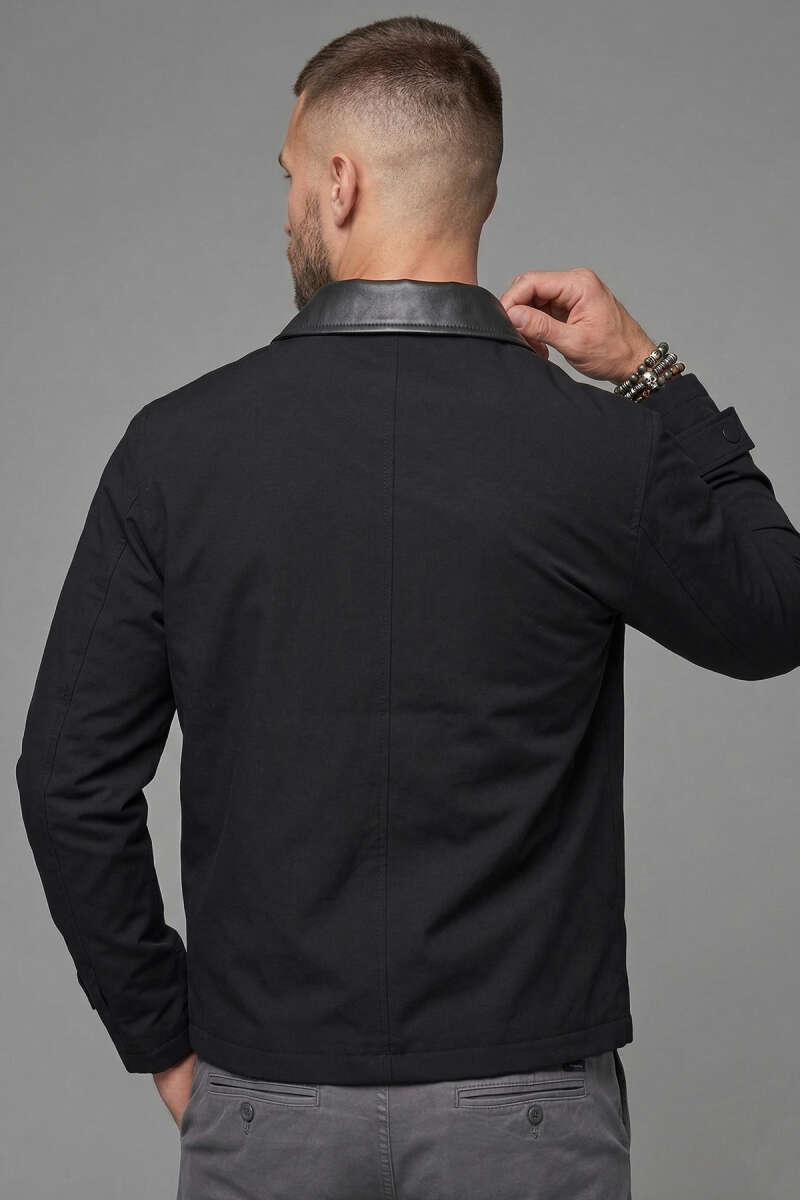 Yaka Deri Detaylı Erkek Ceket Siyah