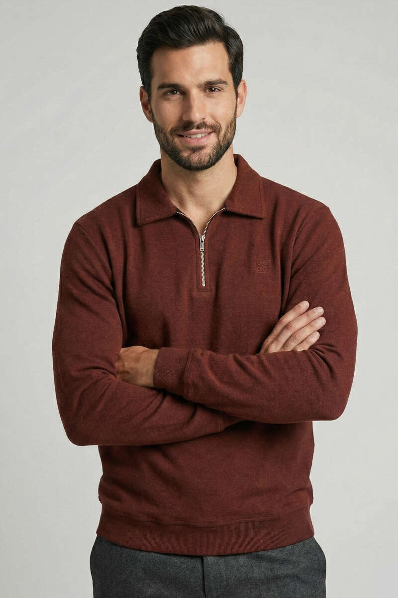 Yaka Detaylı Yarım Fermuar Selanik Erkek Sweatshirt Sütlü Kahve