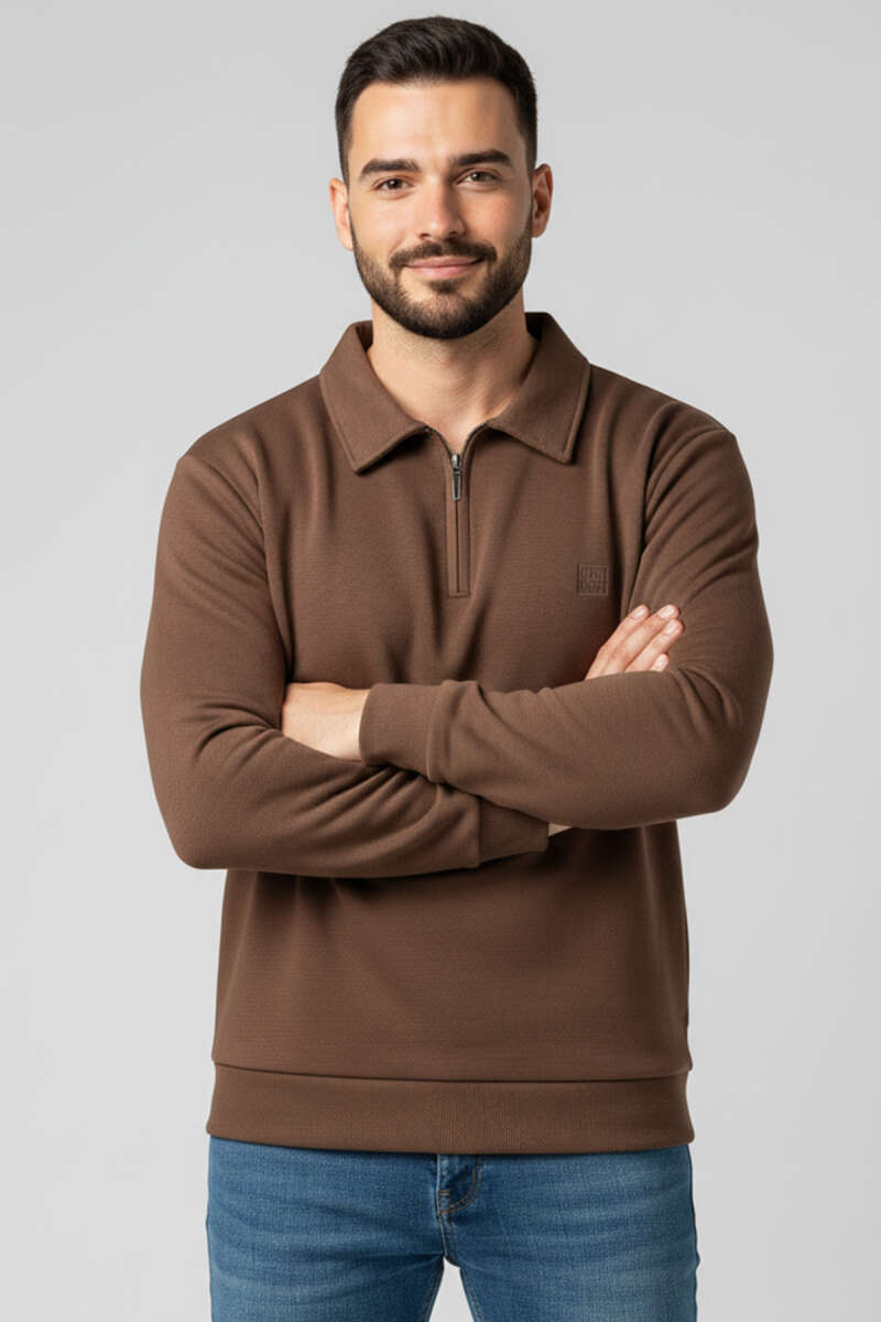 Yaka Detaylı Yarım Fermuar Selanik Erkek Sweatshirt Acı Kahve