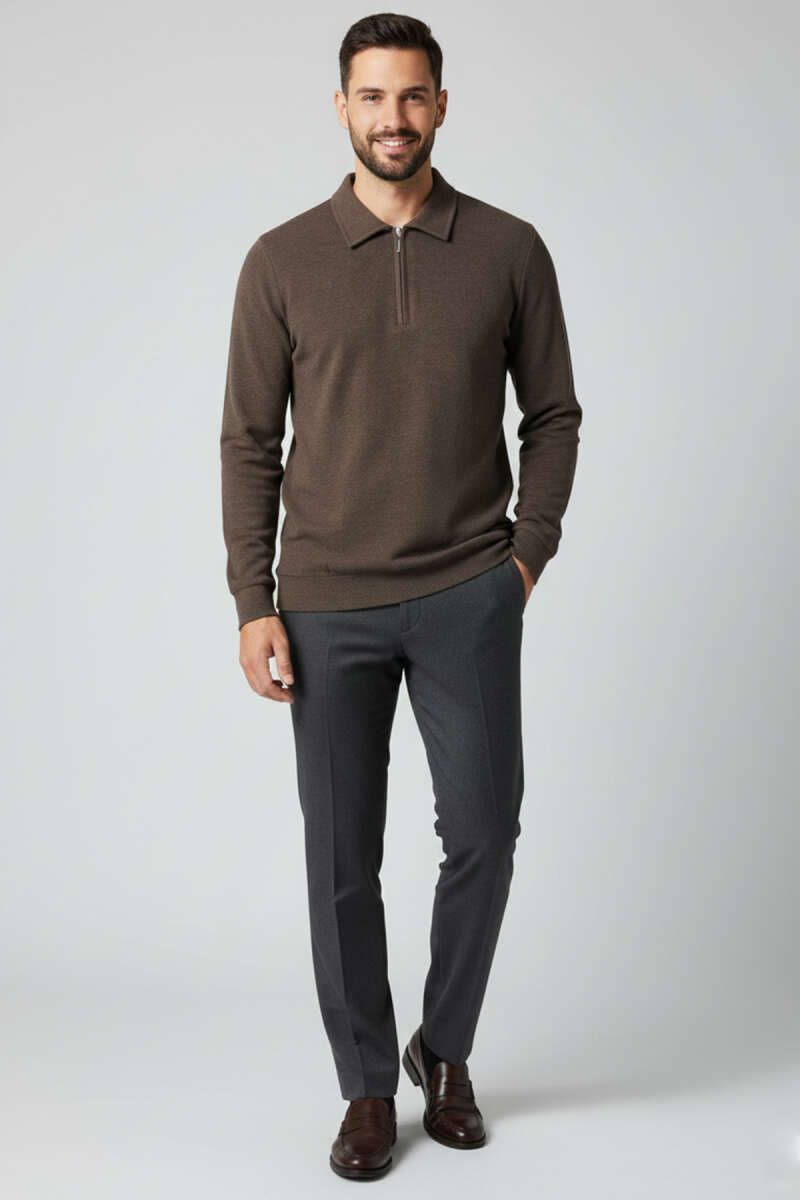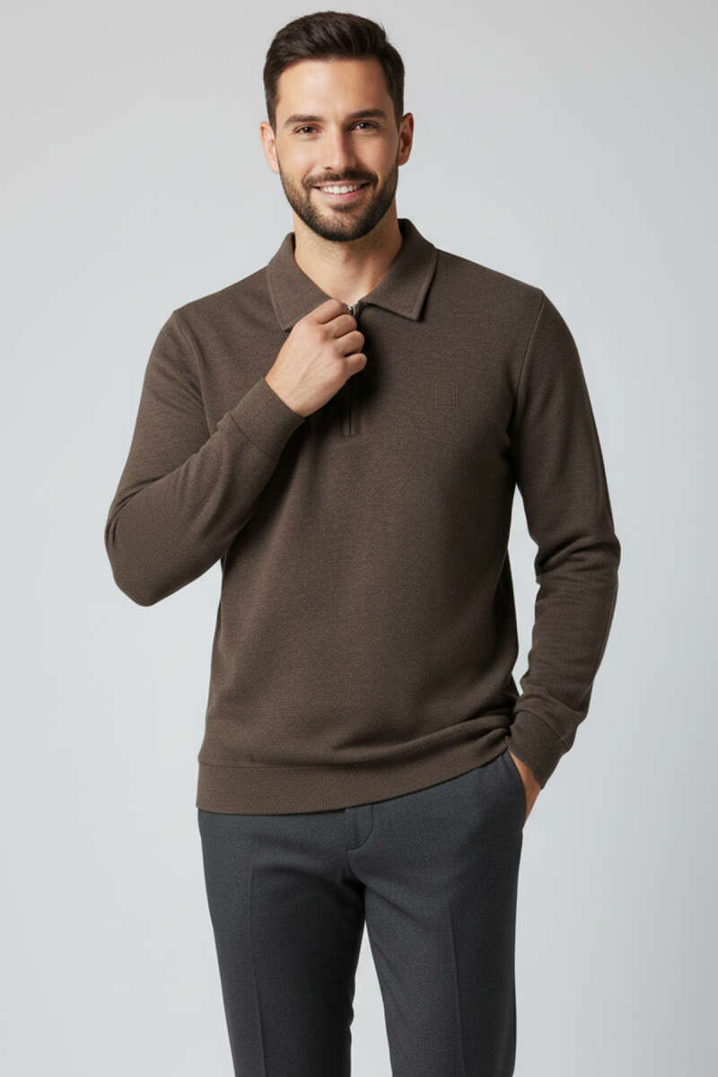 Yaka Detaylı Yarım Fermuar Selanik Erkek Sweatshirt Acı Kahve