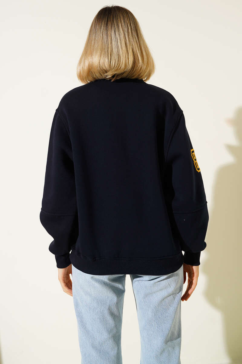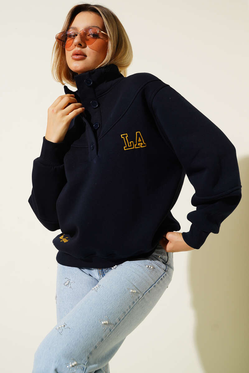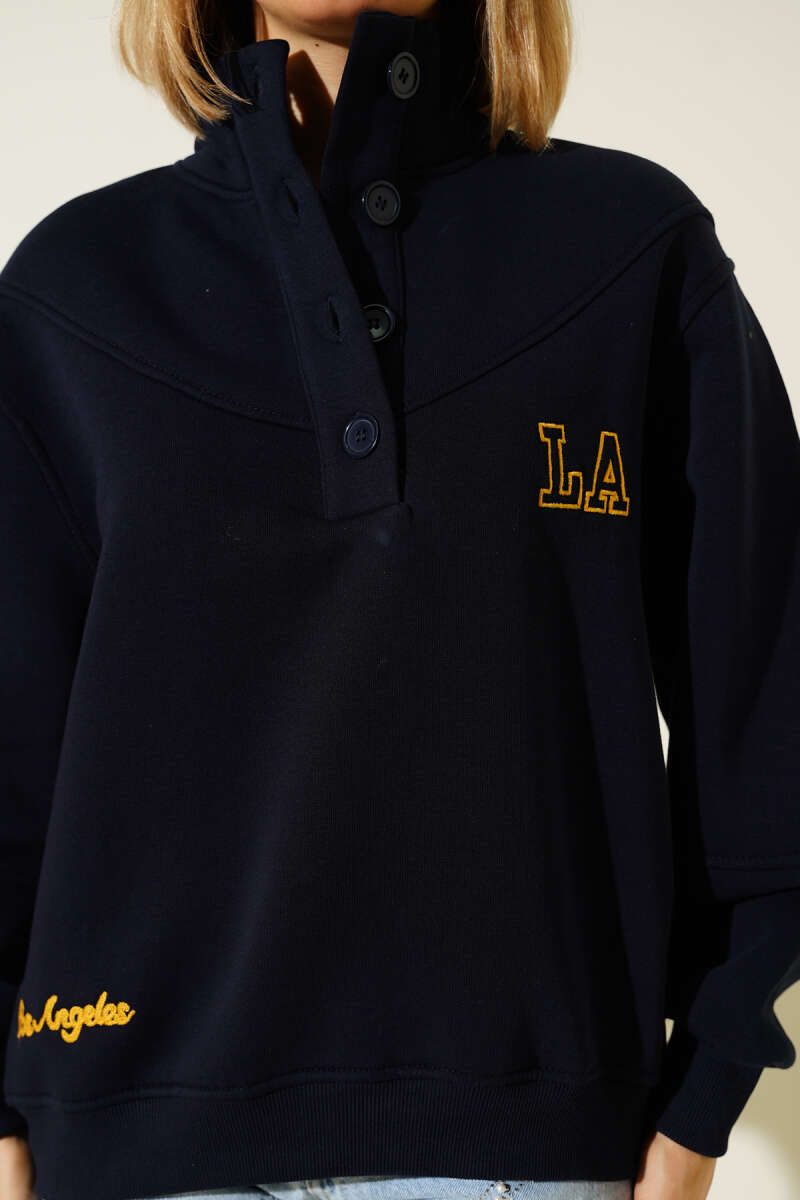 Yaka Düğmeli Baskılı Sweatshirt Lacivert