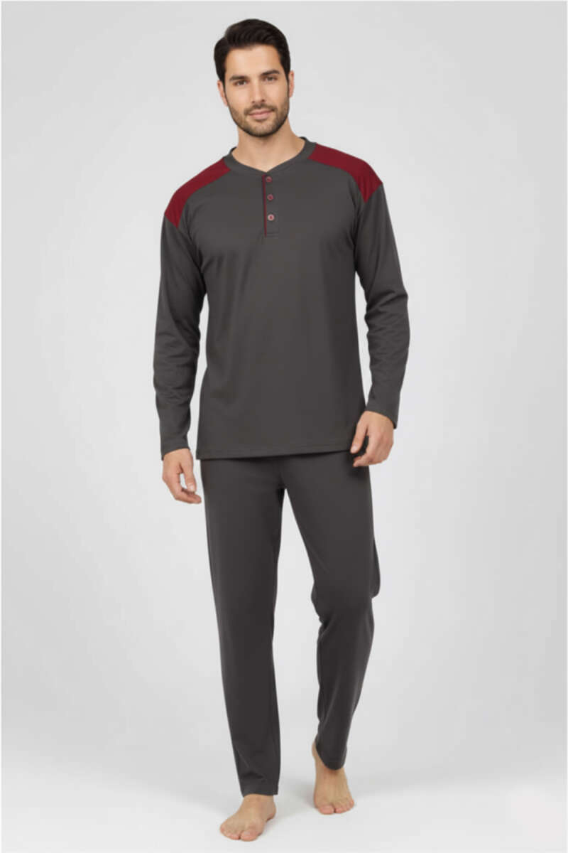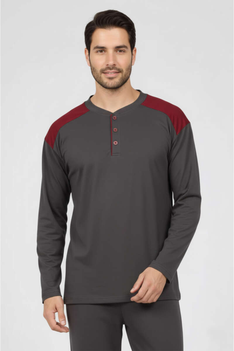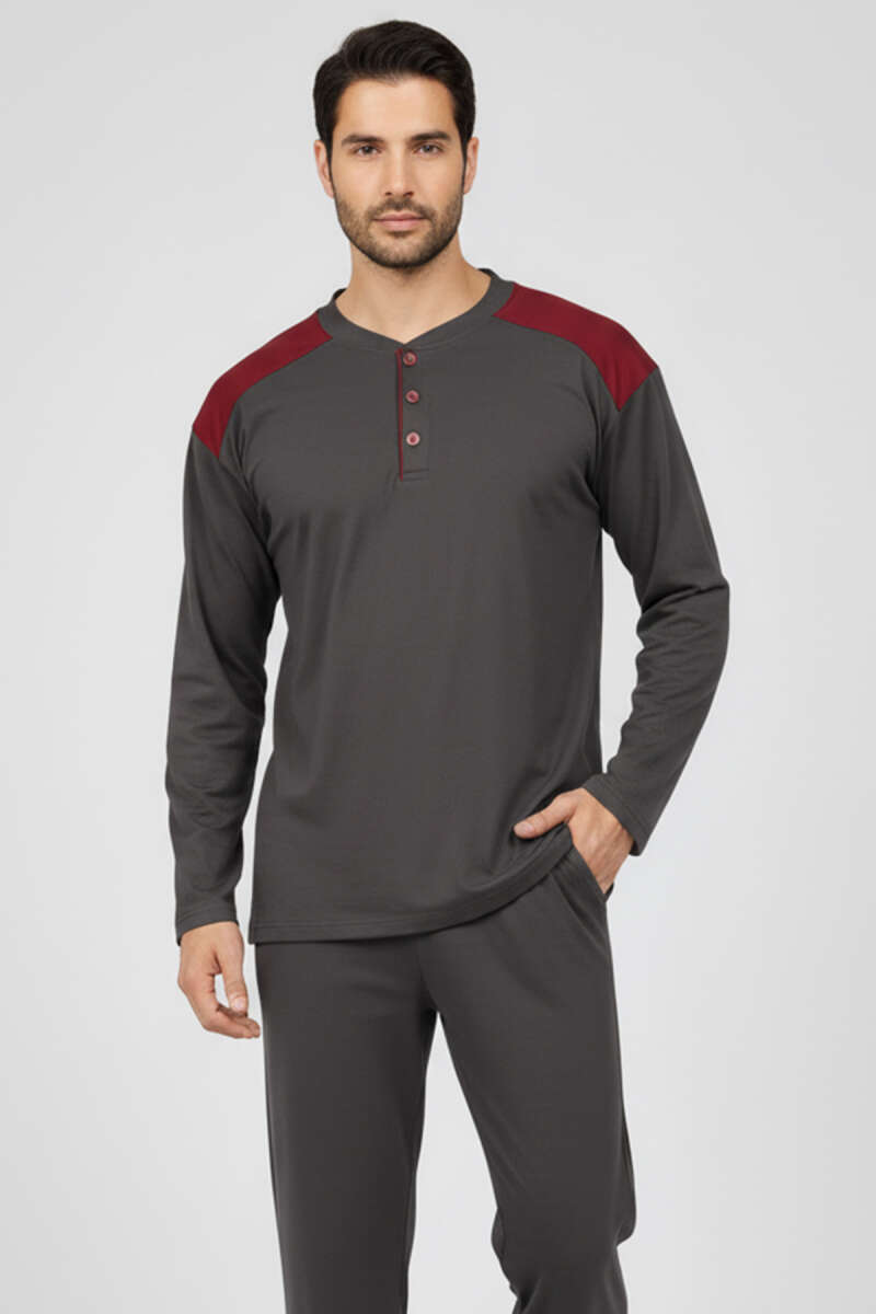 Yaka Düğmeli Büyük Beden İnterlok Erkek Pijama Takım Füme