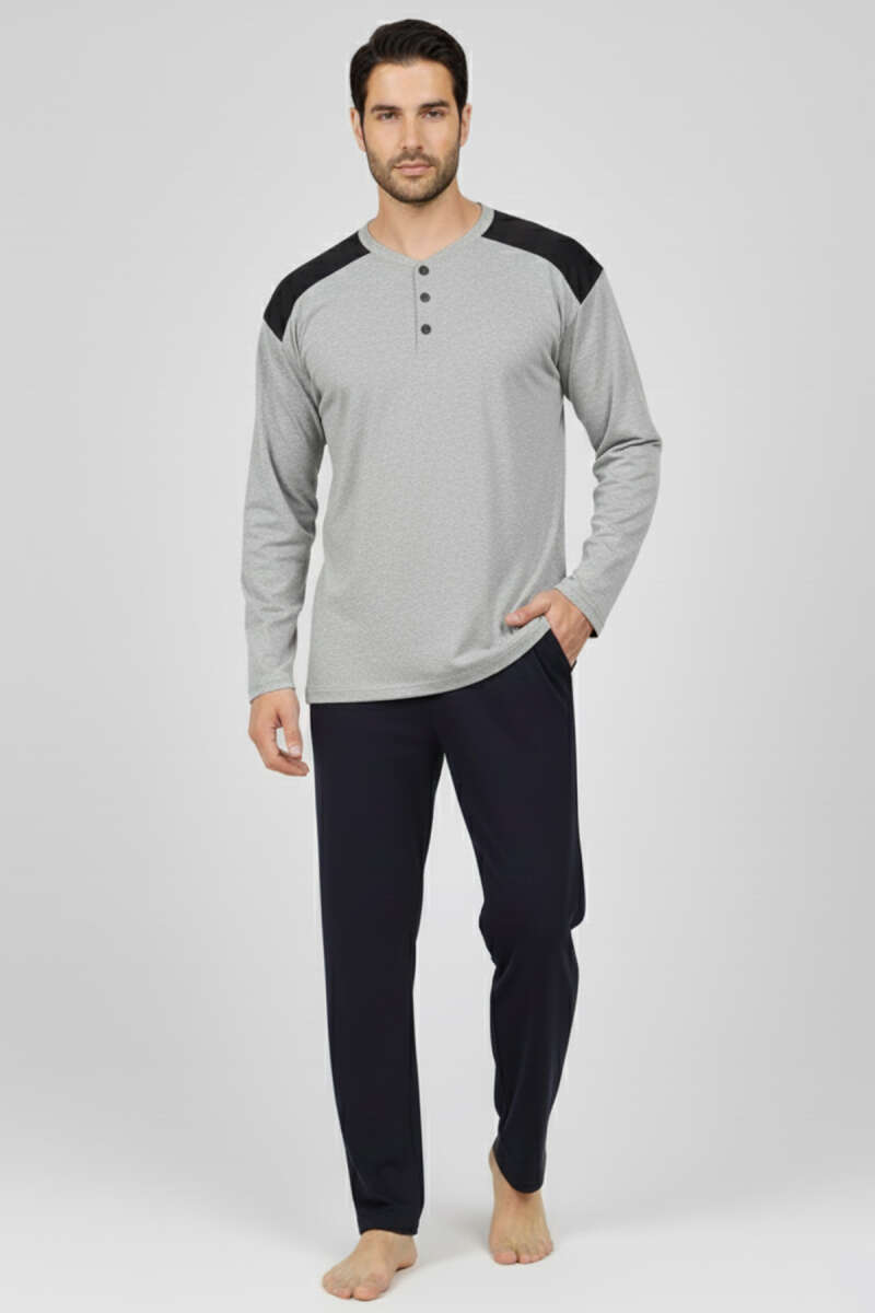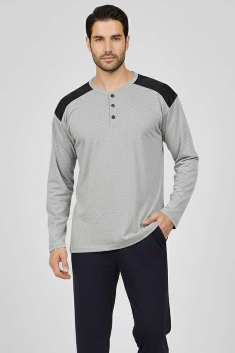 Yaka Düğmeli Büyük Beden İnterlok Erkek Pijama Takım Gri