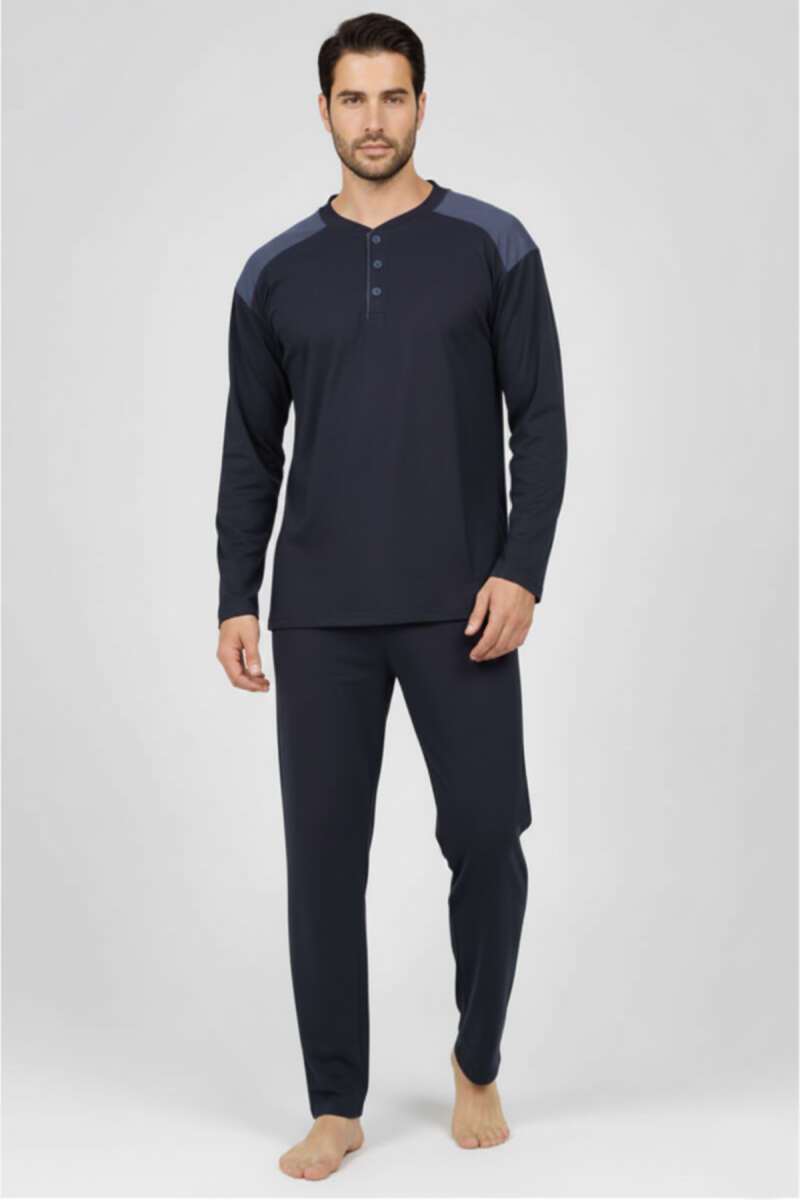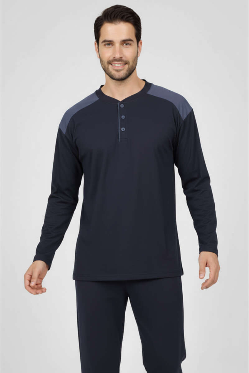 Yaka Düğmeli Büyük Beden İnterlok Erkek Pijama Takım Lacivert