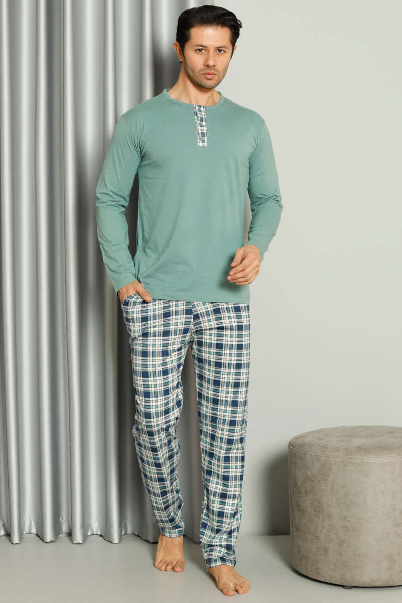 Yaka Düğmeli Ekoseli Erkek Pijama Takımı Mint