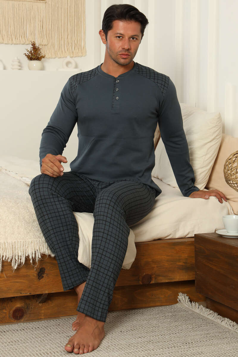 Yaka Düğmeli İnterlok Erkek Pijama Takımı Füme