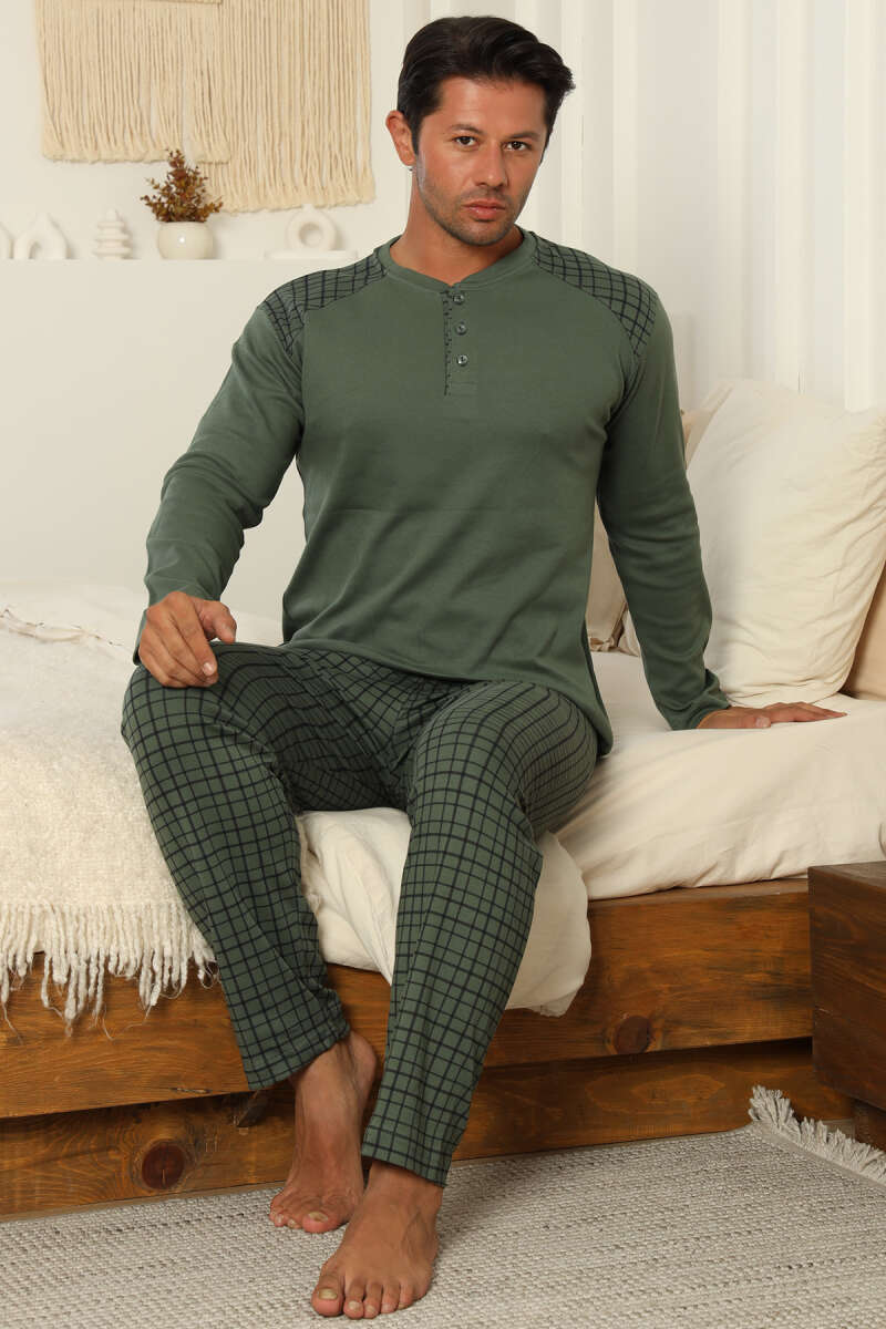 Yaka Düğmeli İnterlok Erkek Pijama Takımı Haki