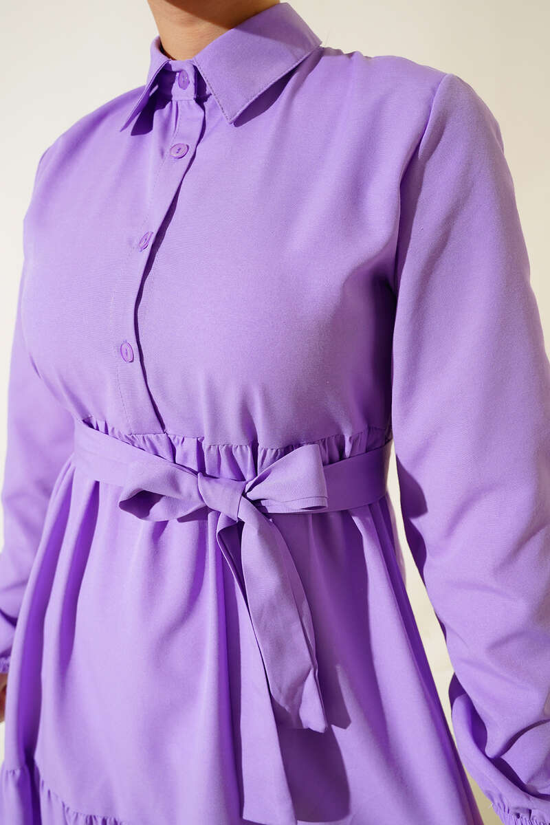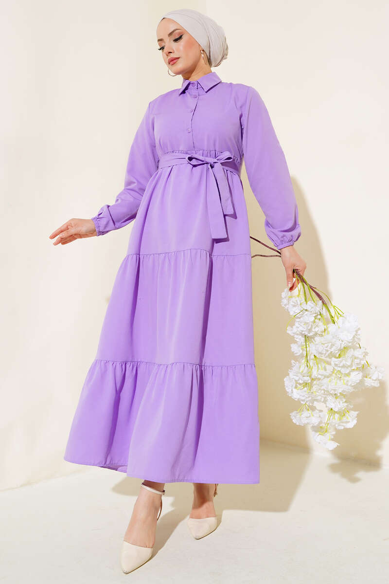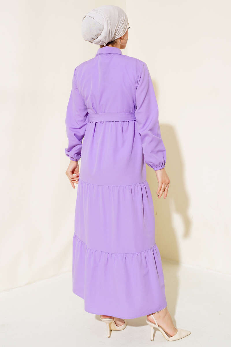 Yaka Düğmeli Kat Kat Elbise Lila