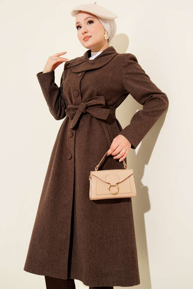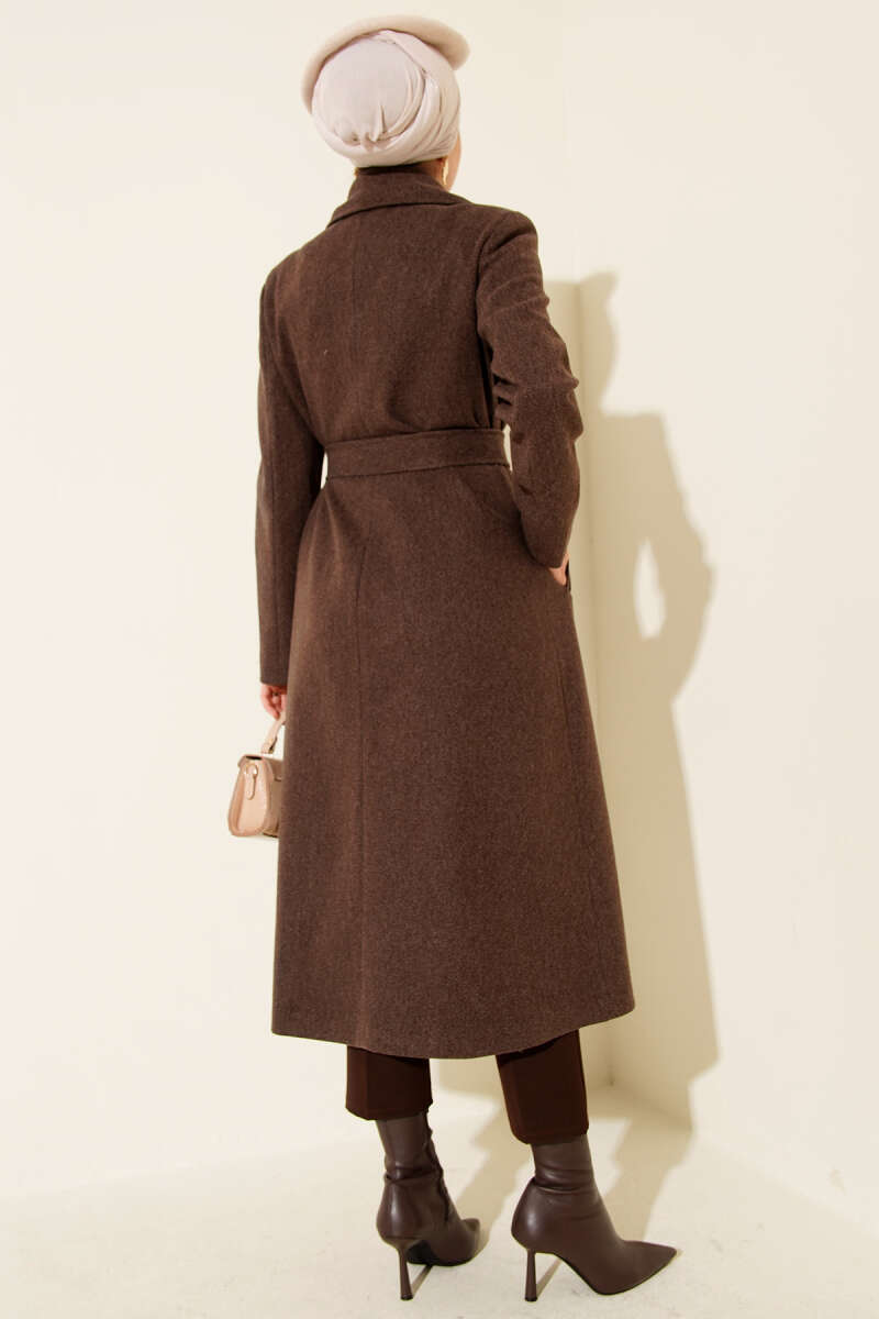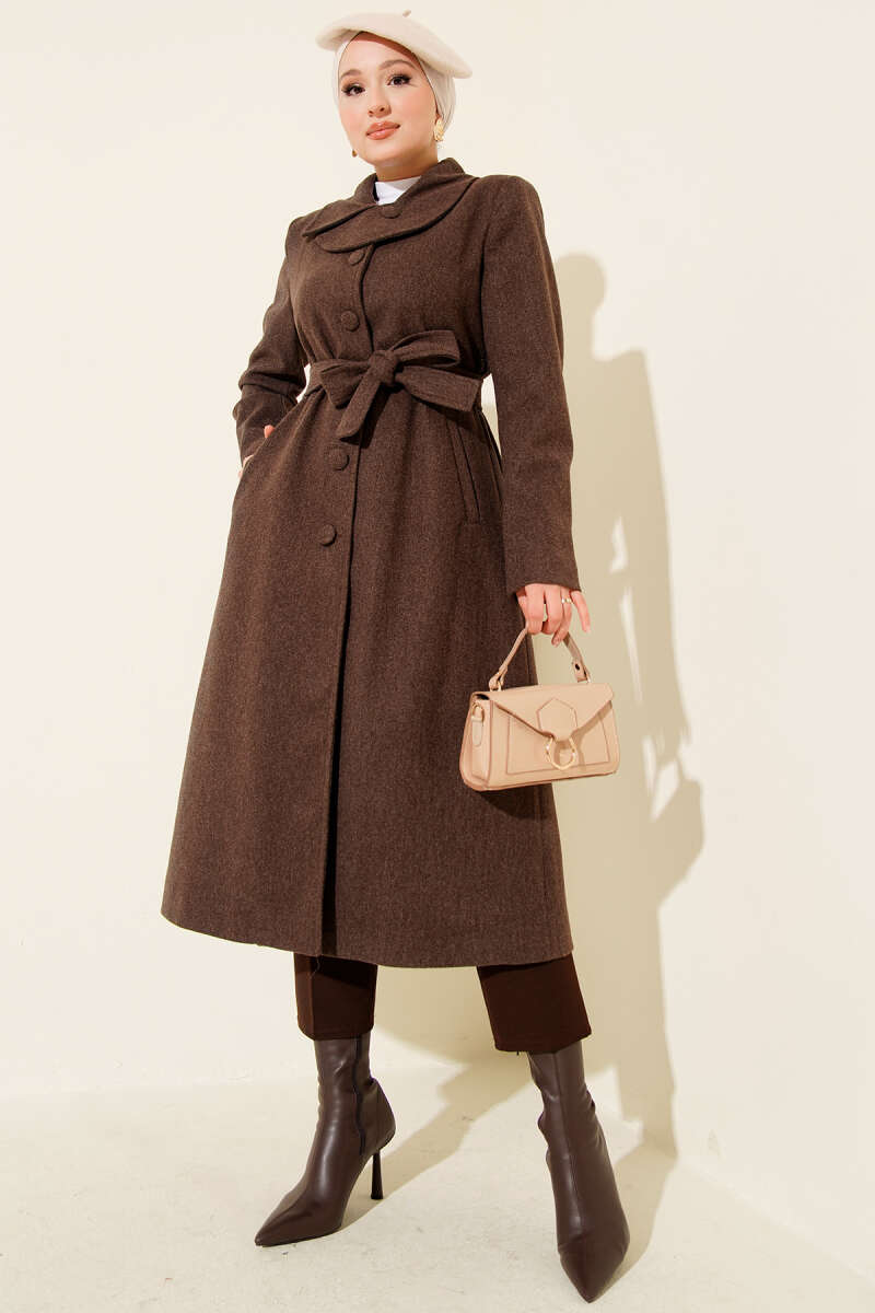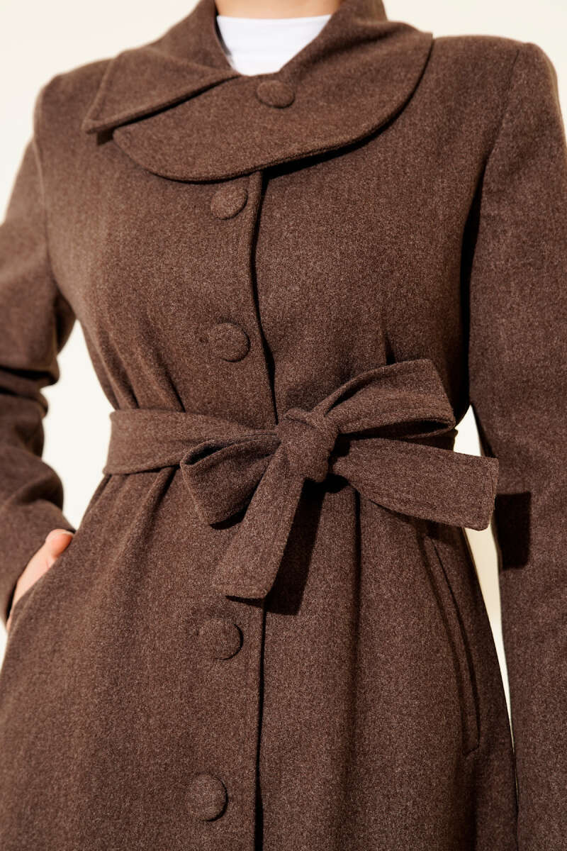 Yaka Düğmeli Kuşaklı Kaşe Kaban Kahve