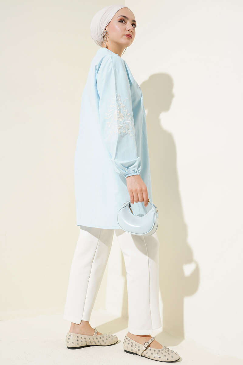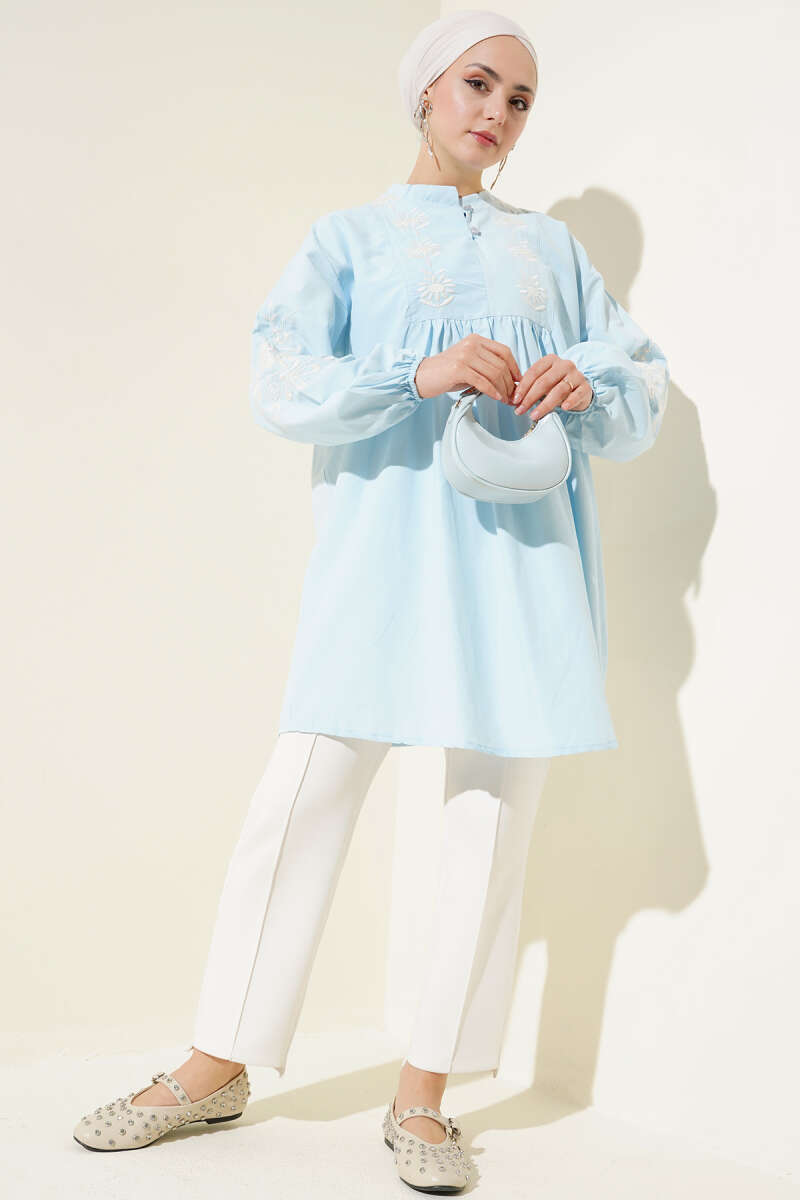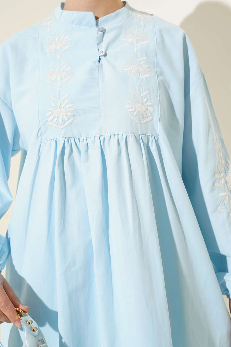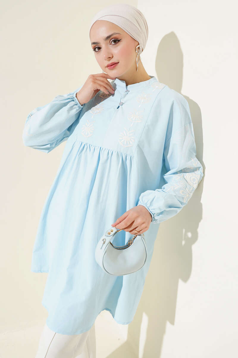 Yaka Düğmeli Nakışlı Tunik Mavi