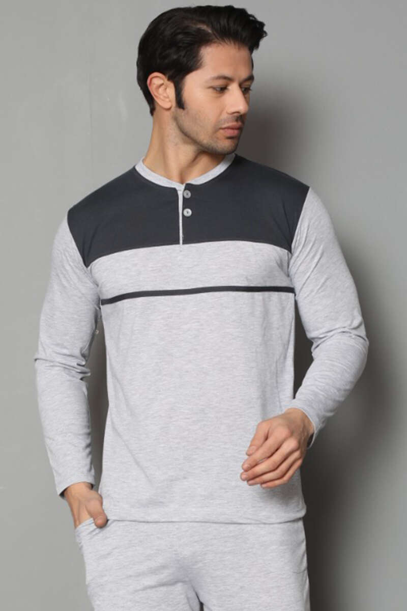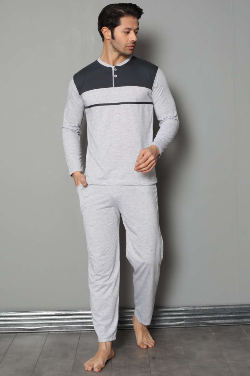 Yaka Düğmeli Uzun Kol Erkek Pijama Takımı Gri