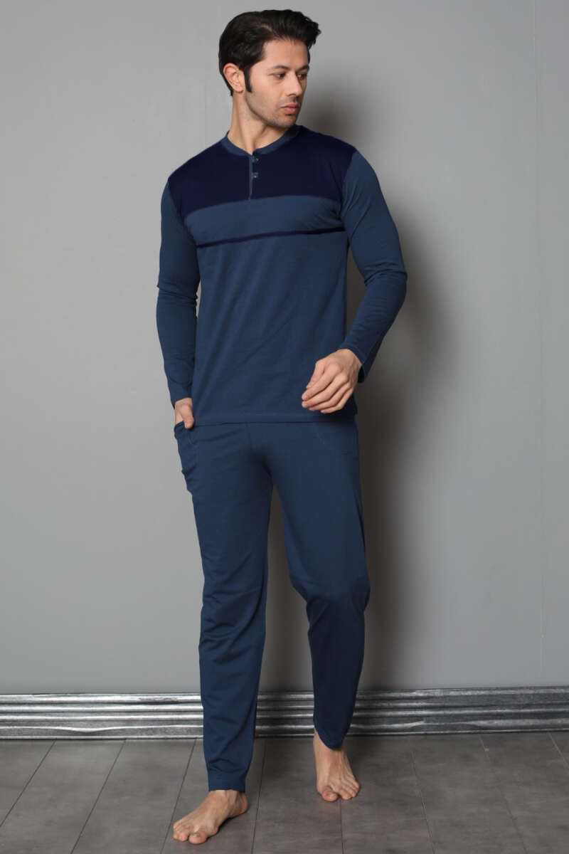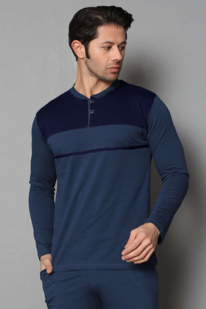 Yaka Düğmeli Uzun Kol Erkek Pijama Takımı Mavi