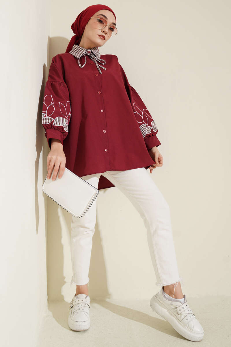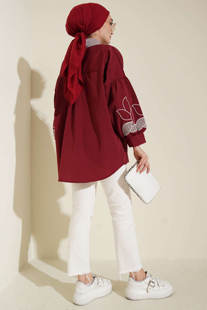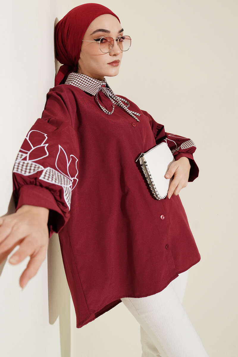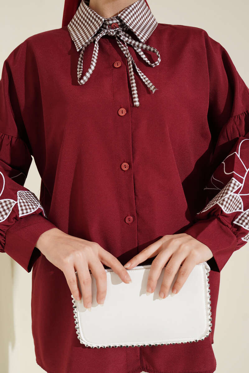 Yaka Ekoseli Kol Nakışlı Gömlek Bordo