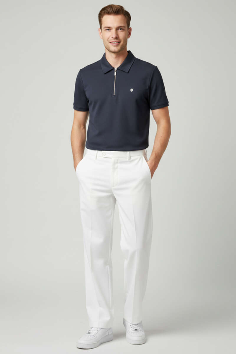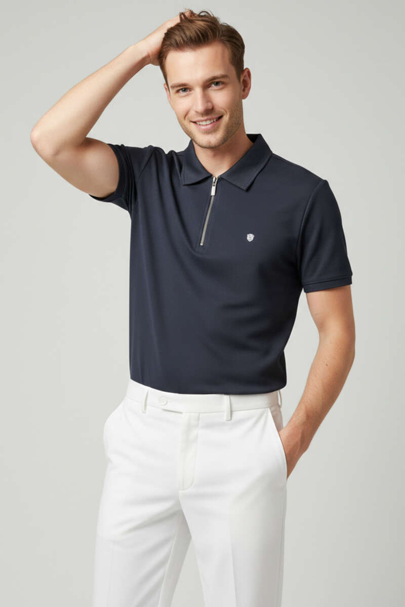 Yaka Fermuarlı Armalı Erkek T-shirt Beyaz