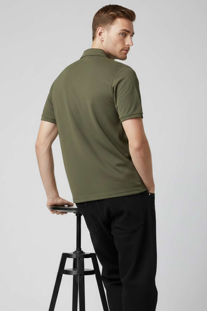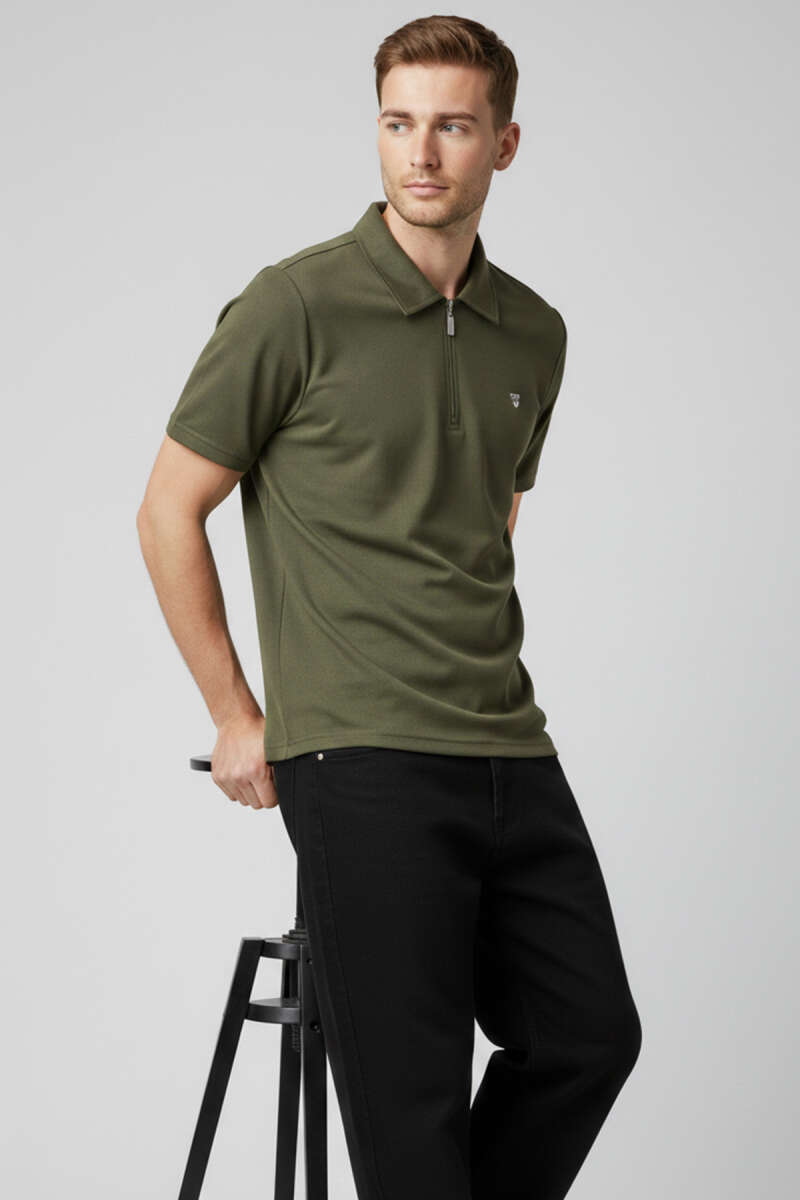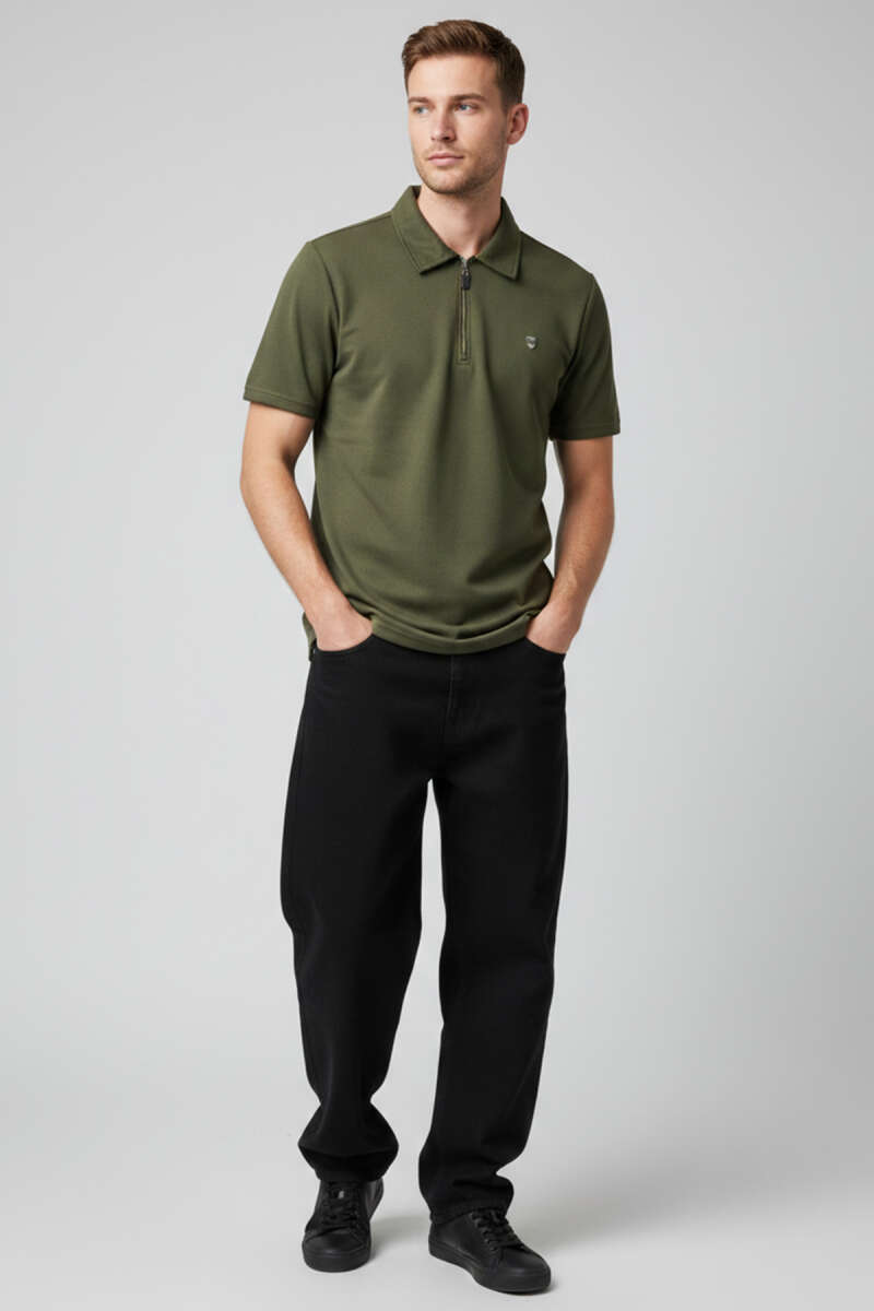 Yaka Fermuarlı Armalı Erkek T-shirt Haki