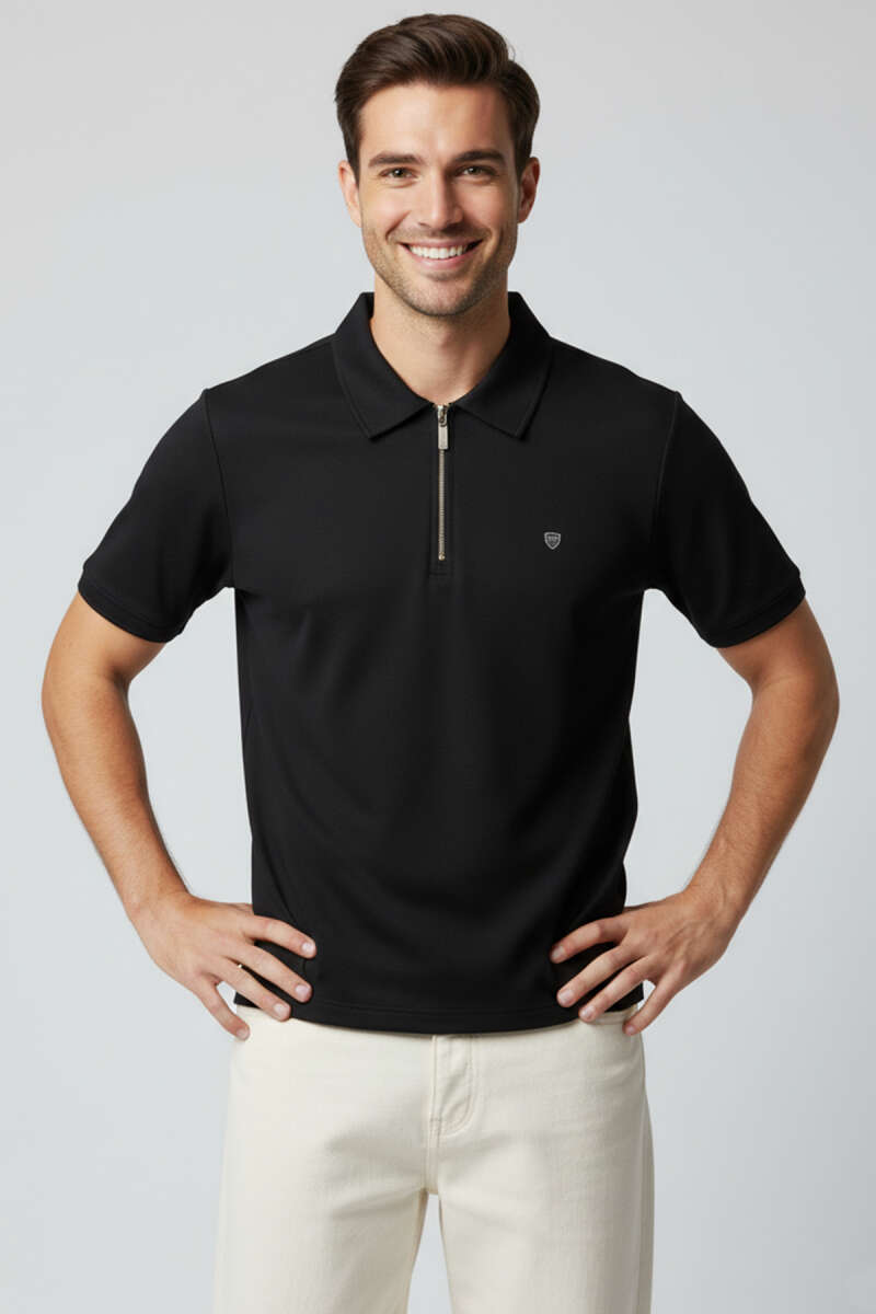 Yaka Fermuarlı Armalı Erkek T-shirt Beyaz