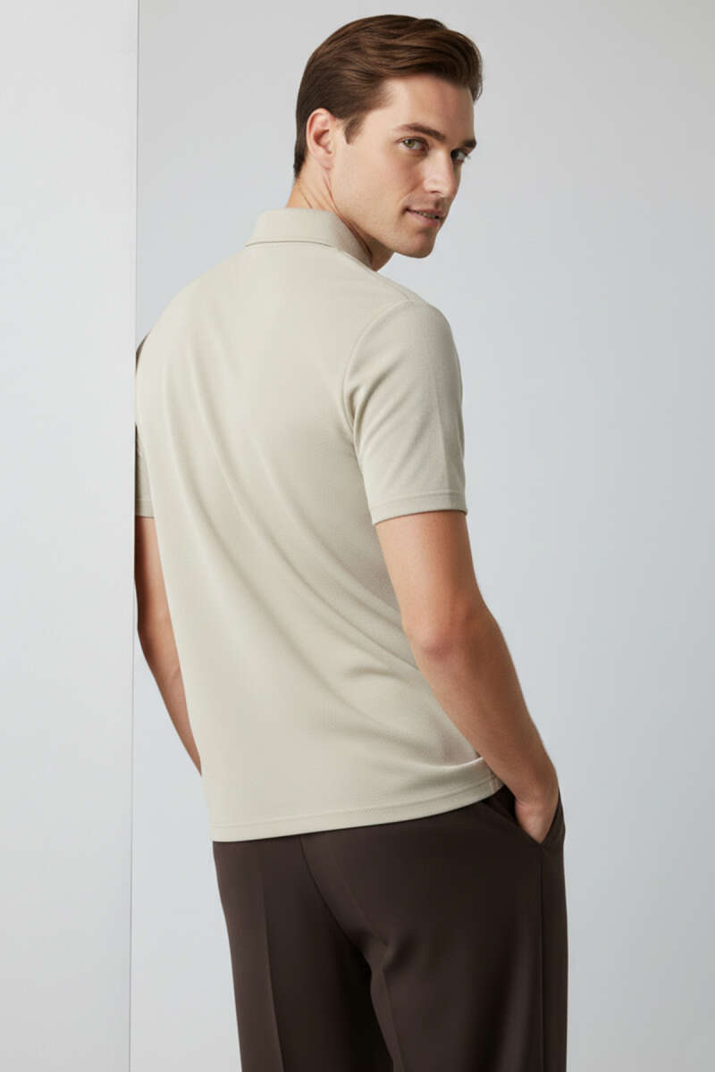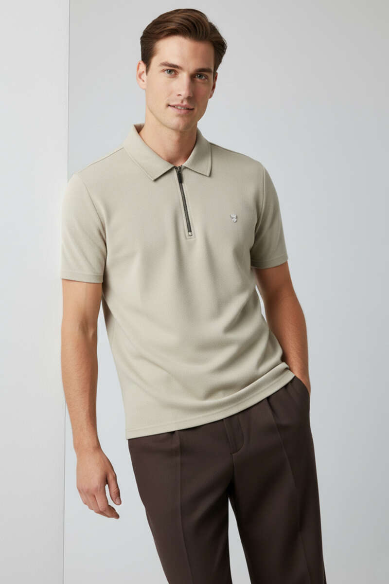 Yaka Fermuarlı Armalı Erkek T-shirt Beyaz