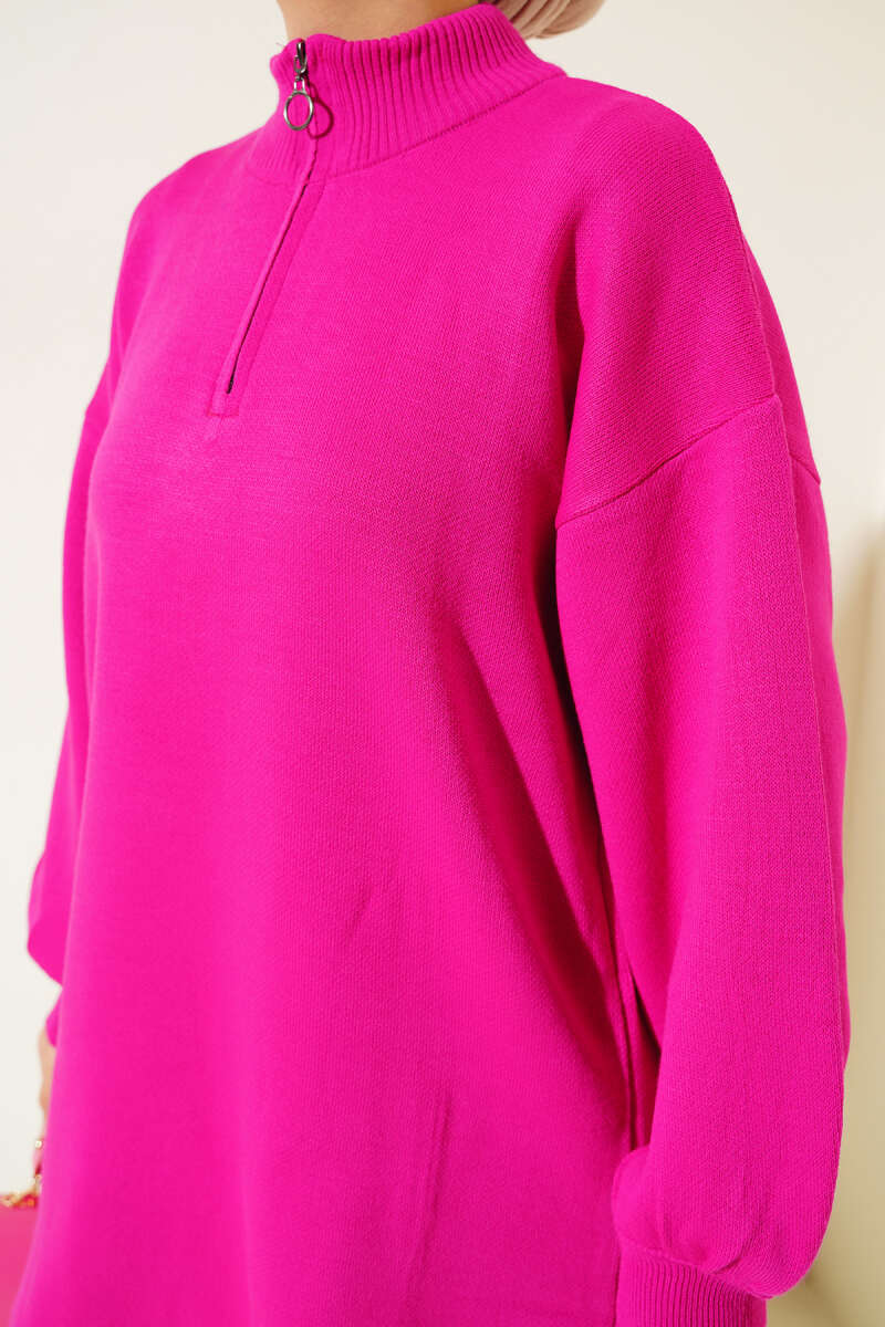 Çizgi Baklava Desen Triko Tunik Fusya