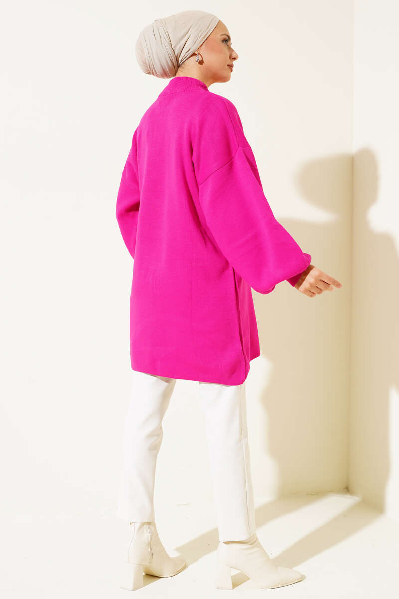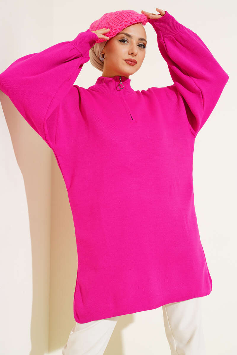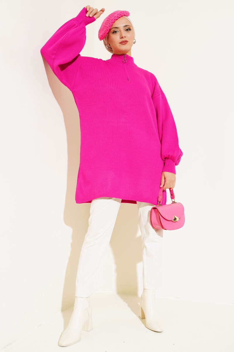 Yaka Fermuarlı Balon Kol Triko Tunik Fuşya
