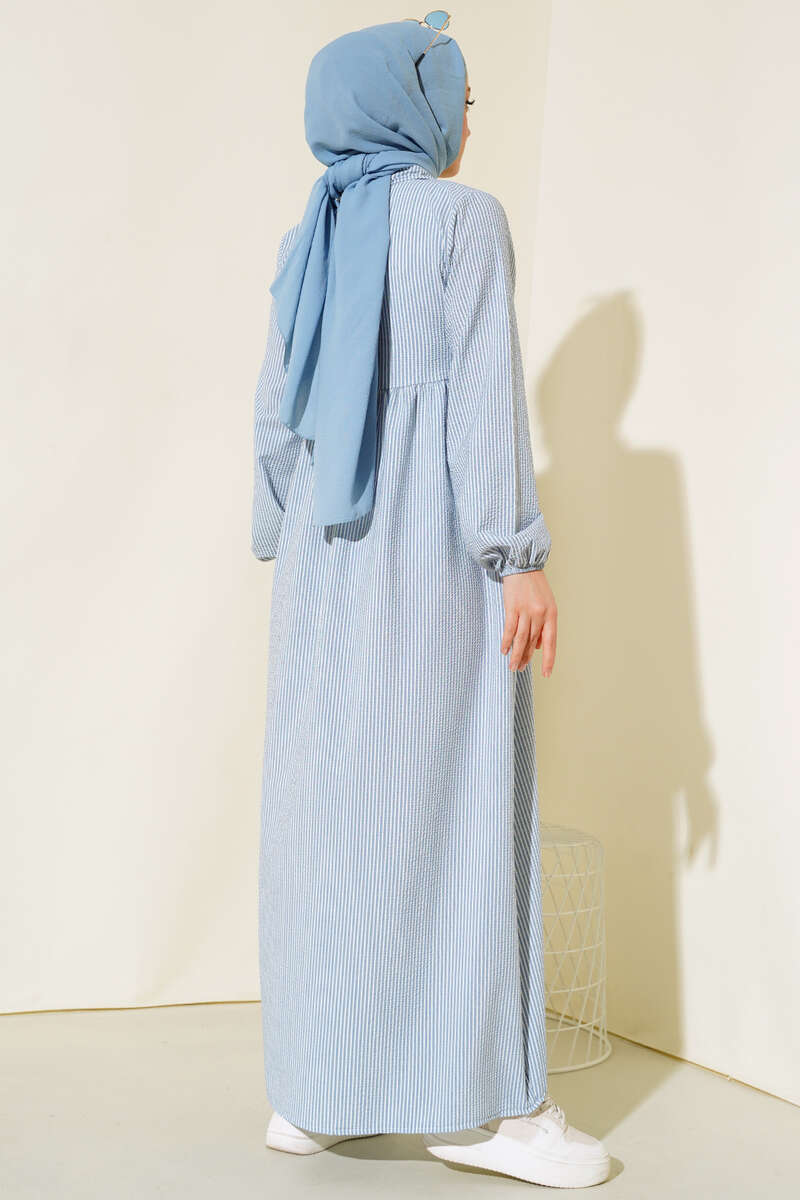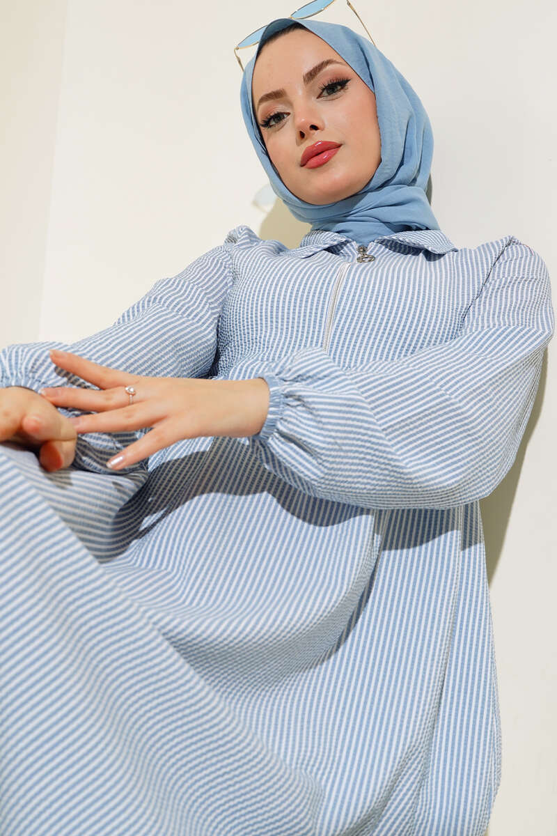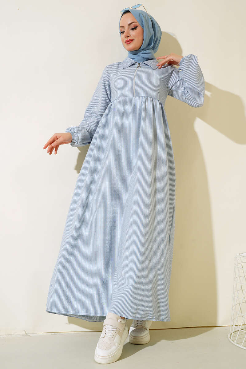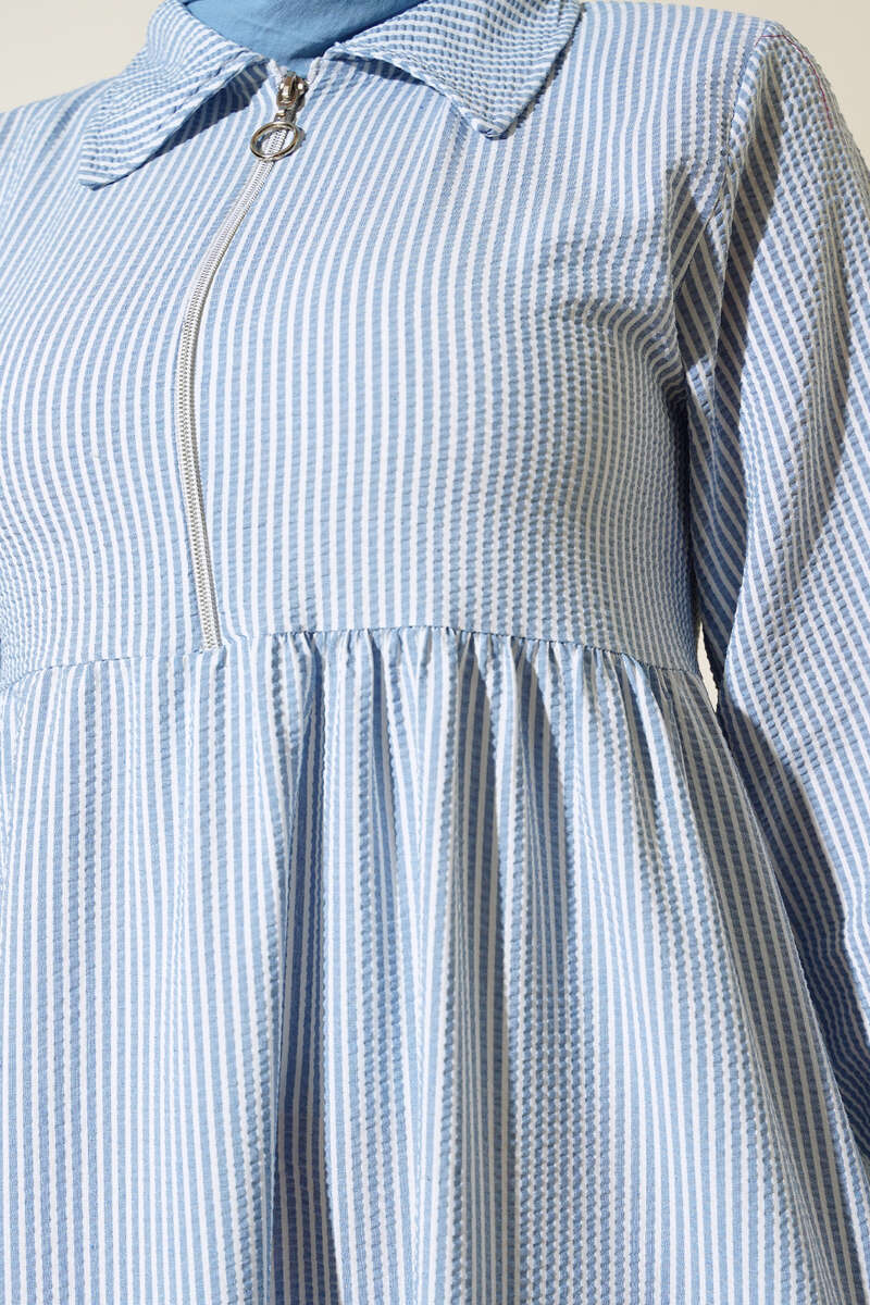 Yaka Fermuarlı Çizgili Gofre Elbise Mavi