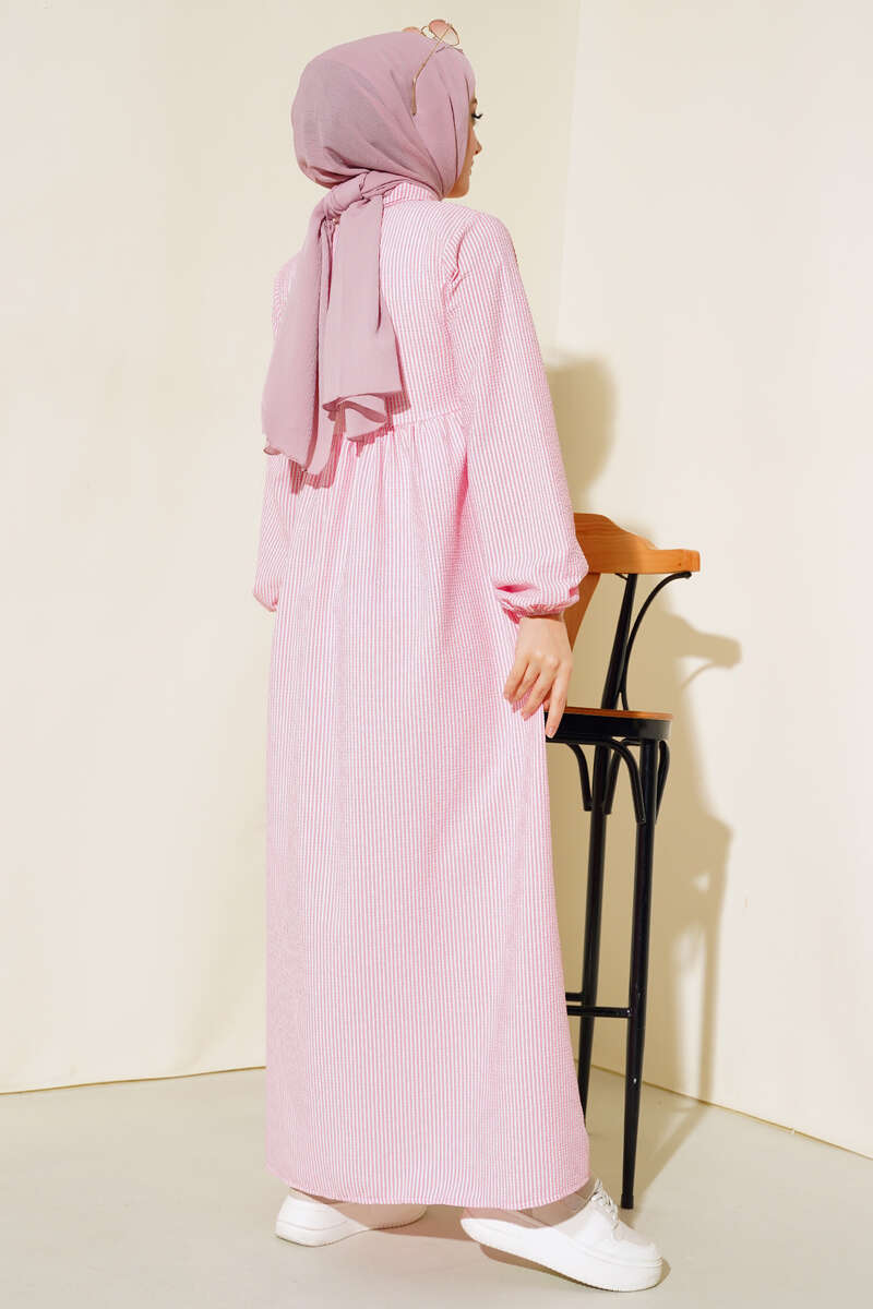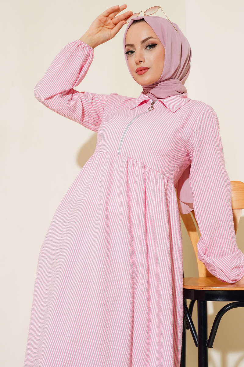 Yaka Fermuarlı Çizgili Gofre Elbise Pembe