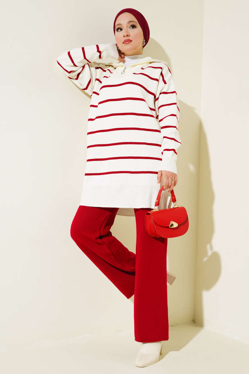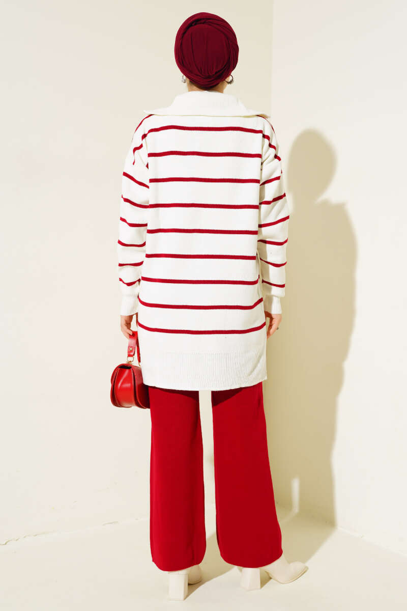 Yaka Fermuarlı Çizgili Triko Takım Kırmızı
