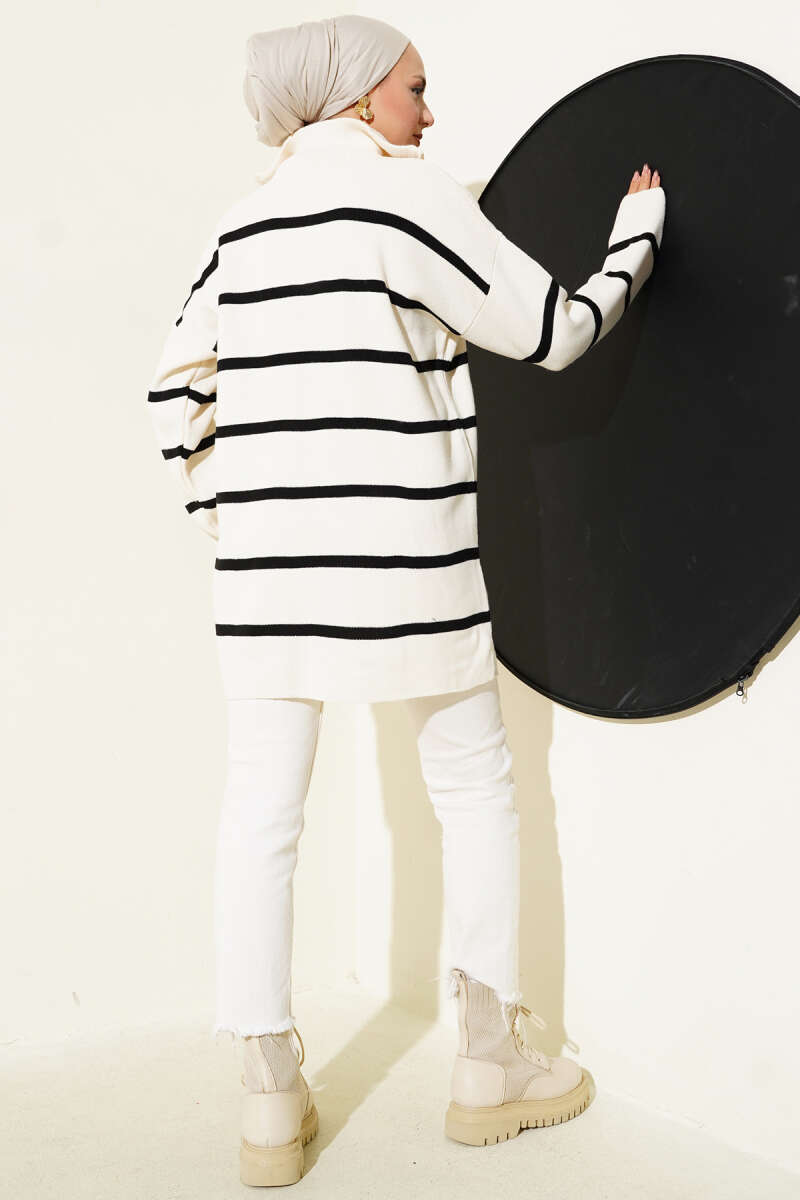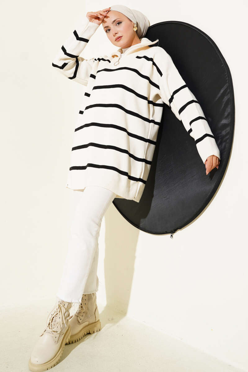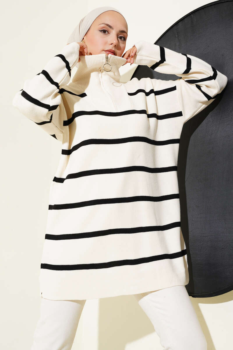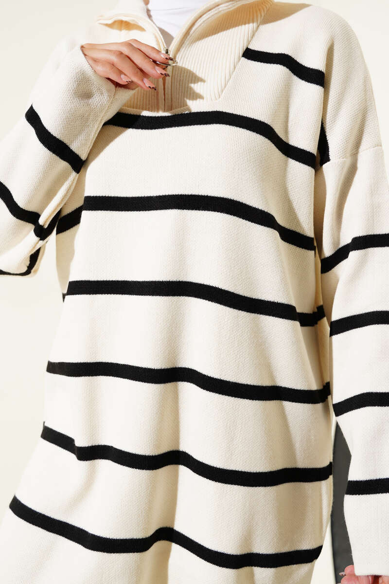 Yaka Fermuarlı Çizgili Triko Tunik Bej