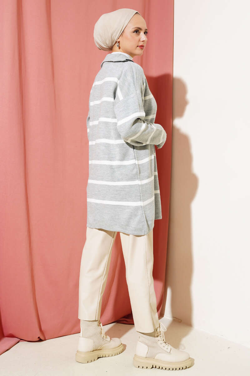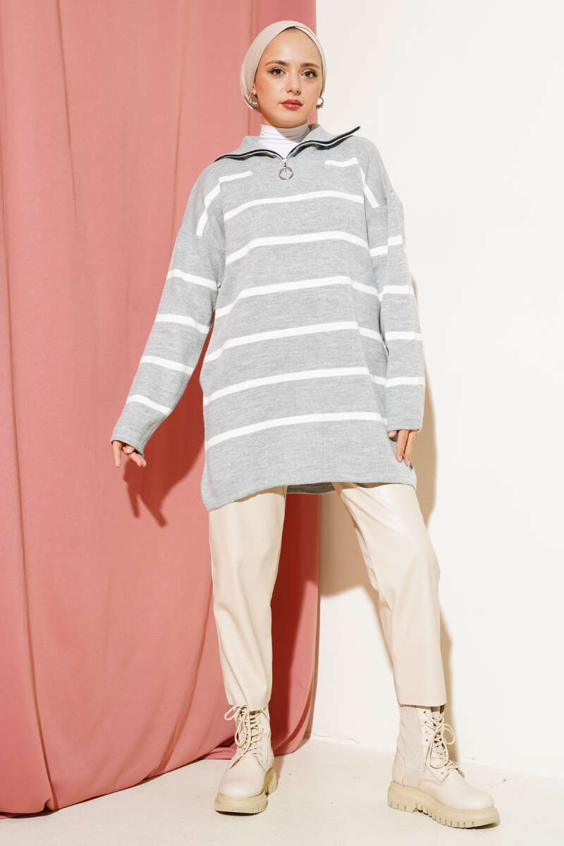 Yaka Fermuarlı Çizgili Triko Tunik Gri