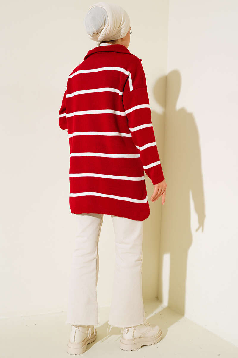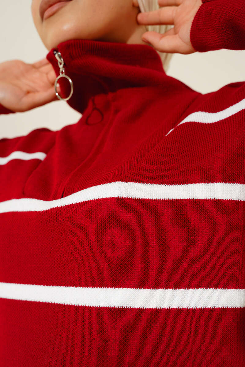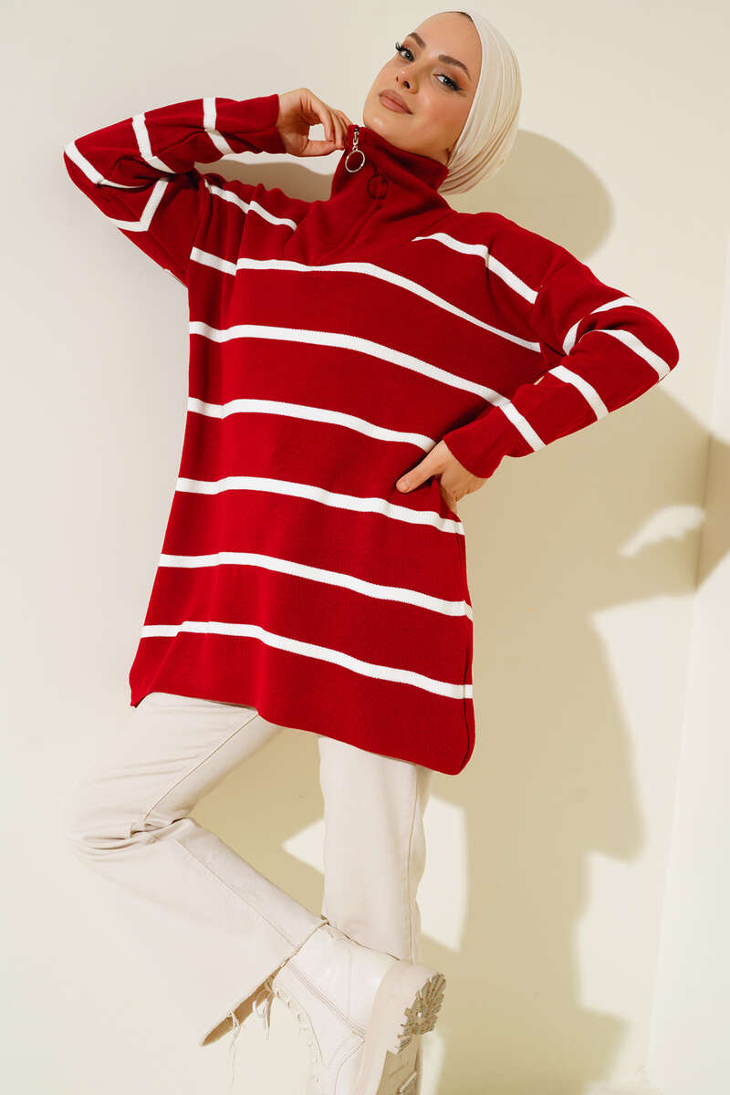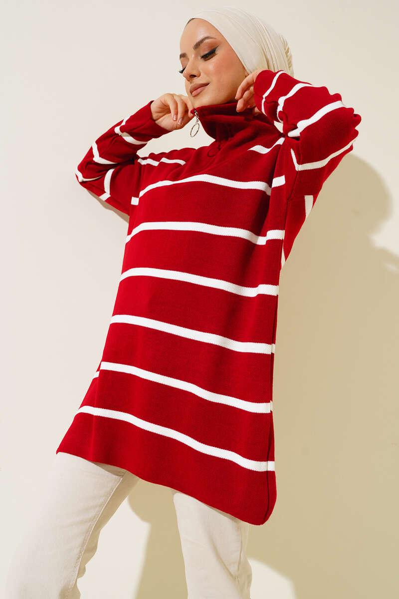 Yeni sezon triko tunik dik yakadır. Yakasına eşlik eden fermuar tuniğimize hava katmaktadır. Yatay çizgili triko tuniğimiz düşük omuz modeldir.