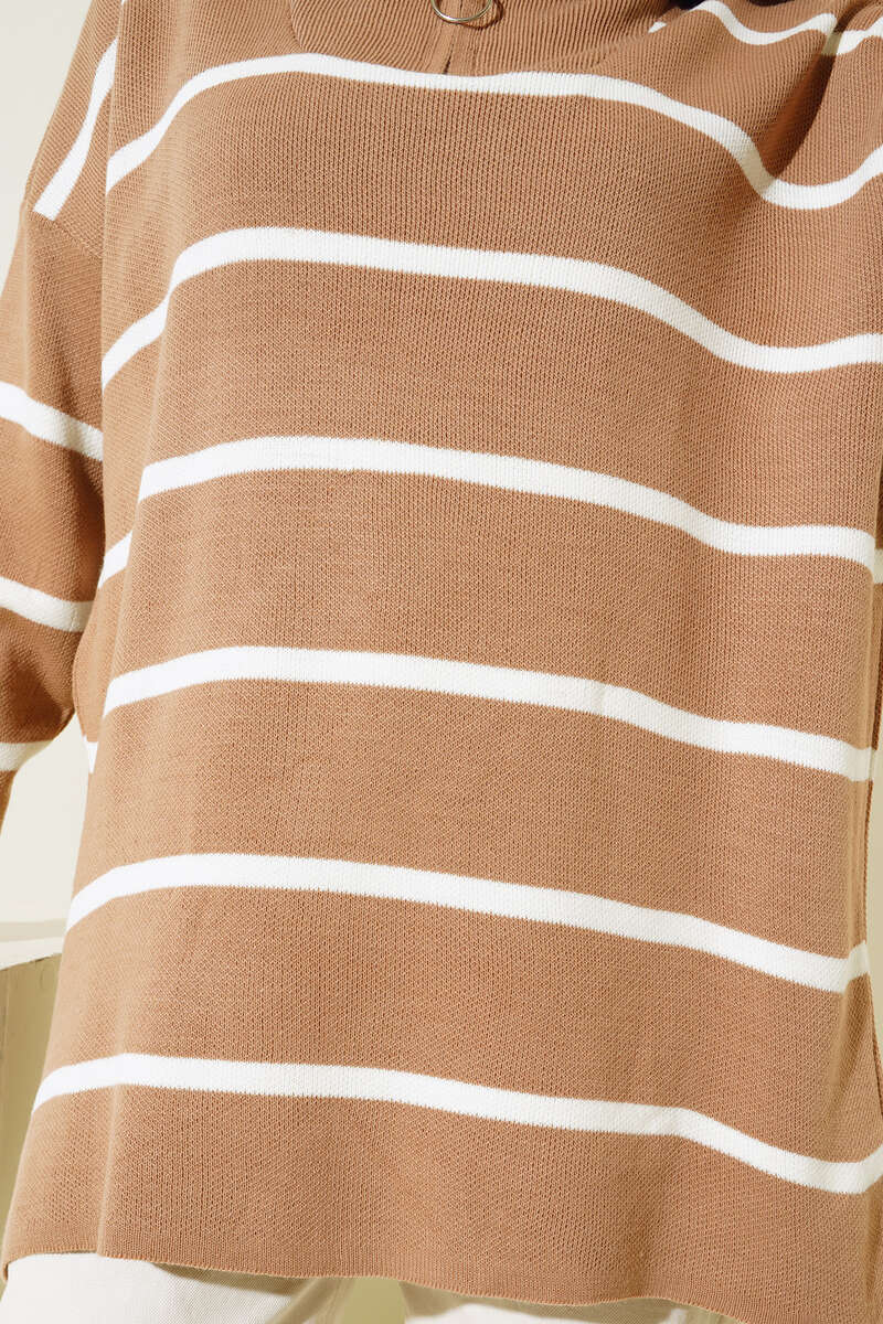 Yeni sezon triko tunik dik yakadır. Yakasına eşlik eden fermuar tuniğimize hava katmaktadır. Yatay çizgili triko tuniğimiz düşük omuz modeldir.