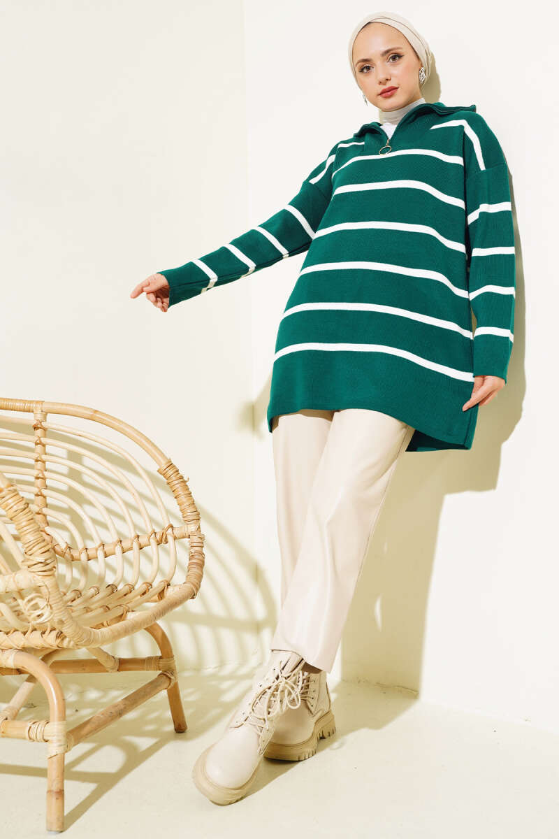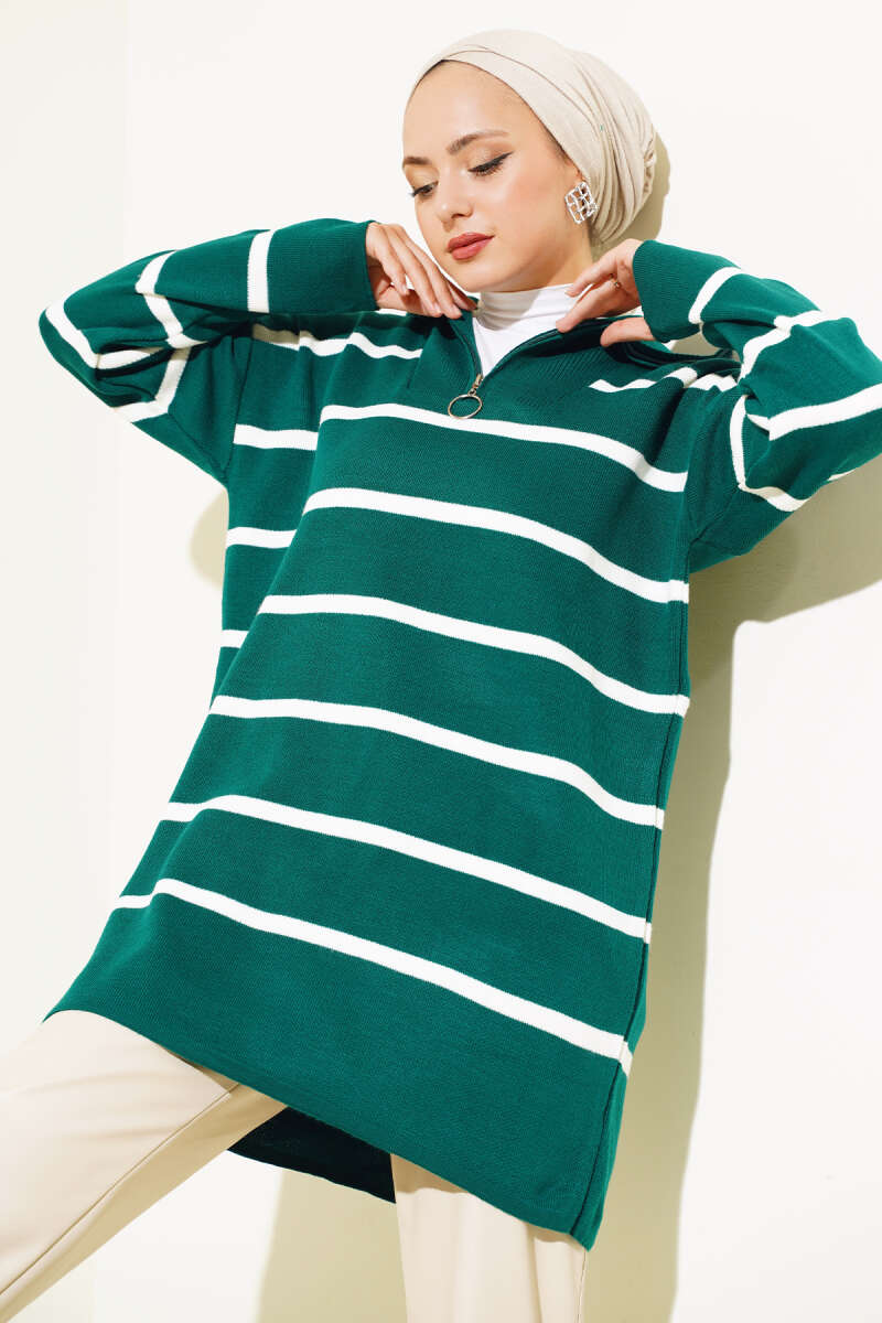 Yaka Fermuarlı Çizgili Triko Tunik Nefti