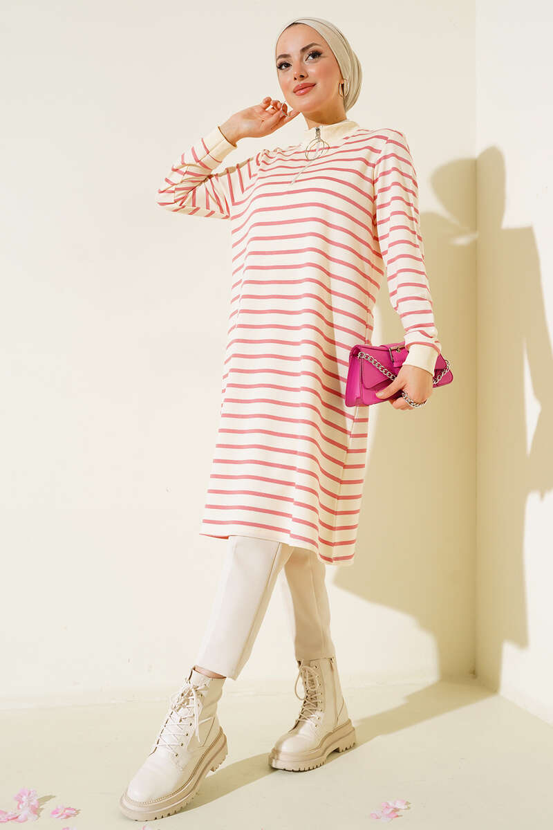 Yeni sezonun çizgili tuniği fermuar detayı ile şık durmaktadır. Uzun ince çizgili tuniğimizin kolları rabinalıdır. Dik yaka tuniğimizin yaka kısmında fermuar bulunmaktadır. Kombinlerinizin tamamlayıcısı olan tuniğimiz sizleri beklemektedir.