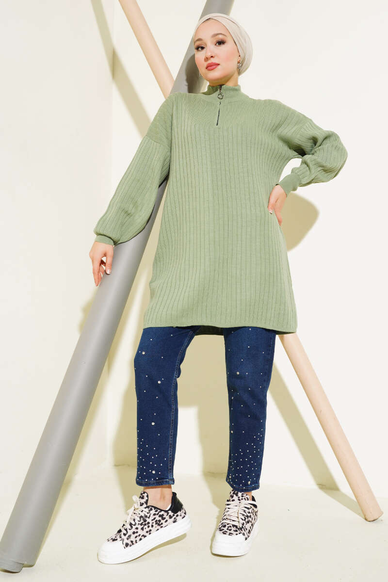 Baklava Desenli Basic Triko Tunik Yağ Yeşili
