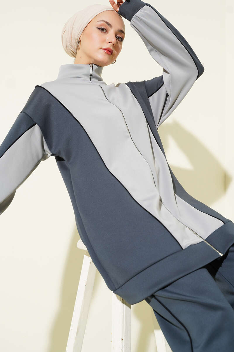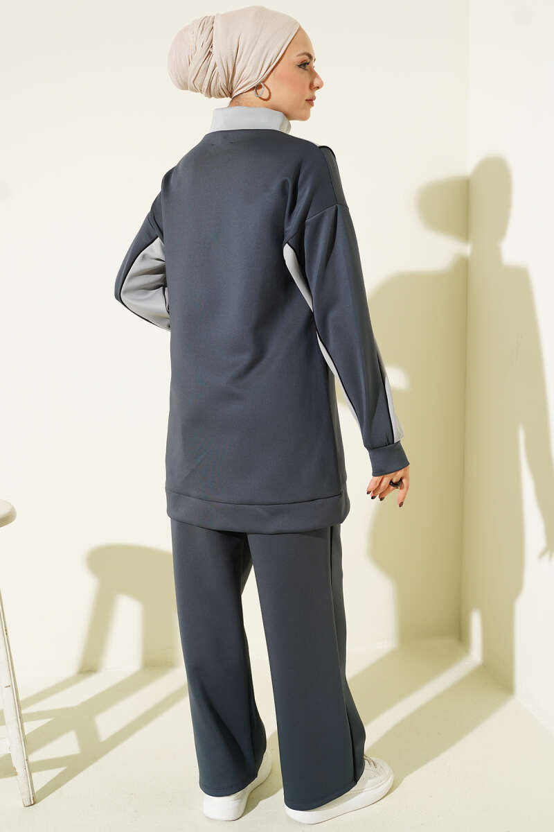 Yarım Fermuarlı Loyşa Şeritli İkili Takım Füme