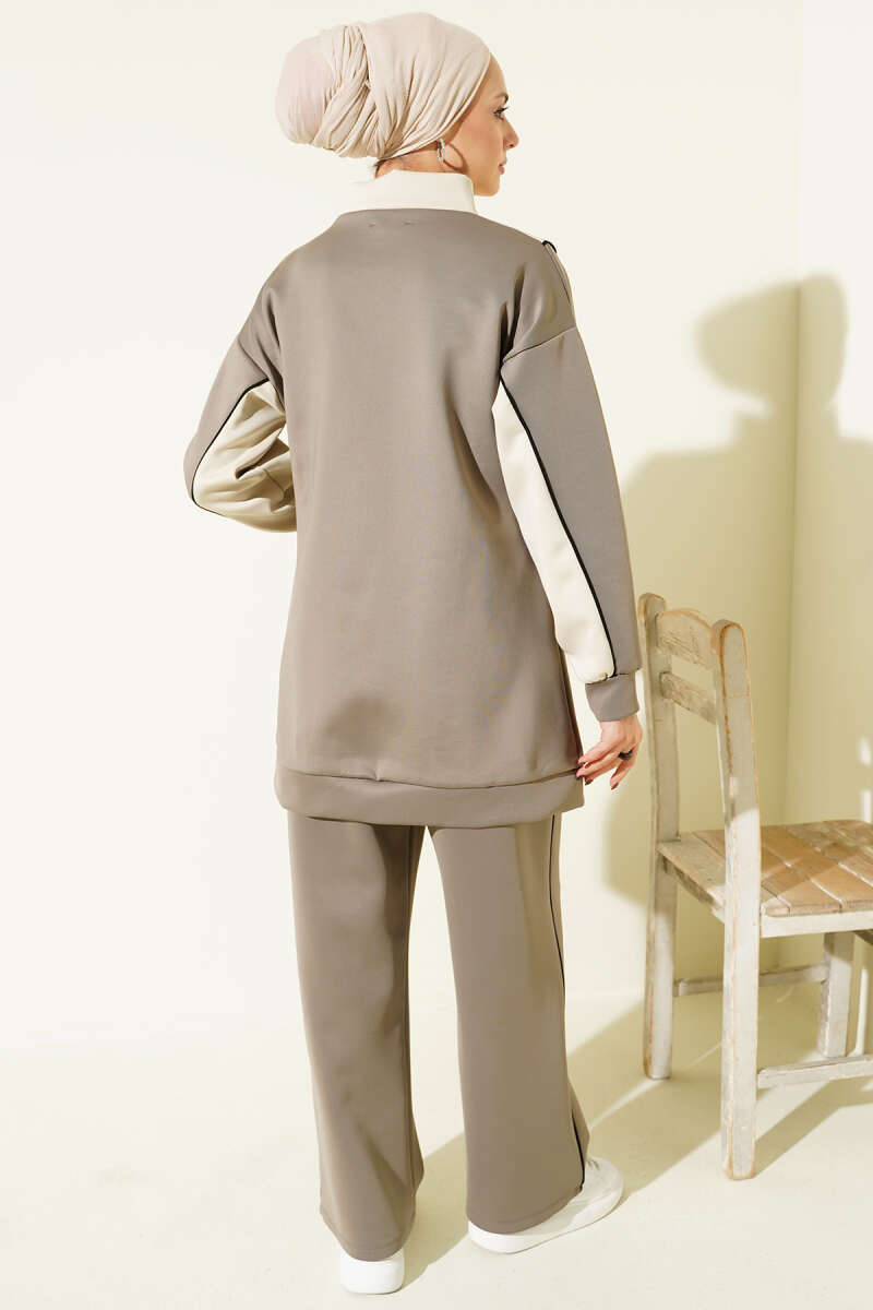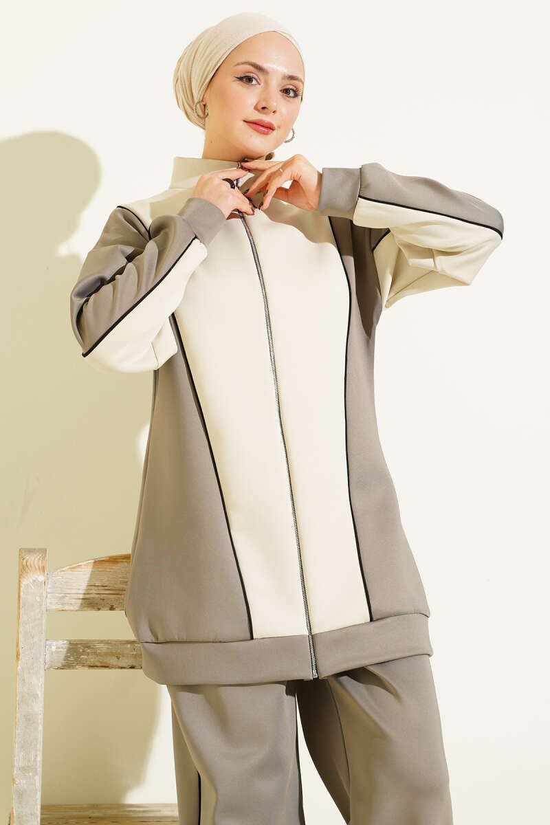 Yaka Fermuarlı Garnili İkili Takım Vizon
