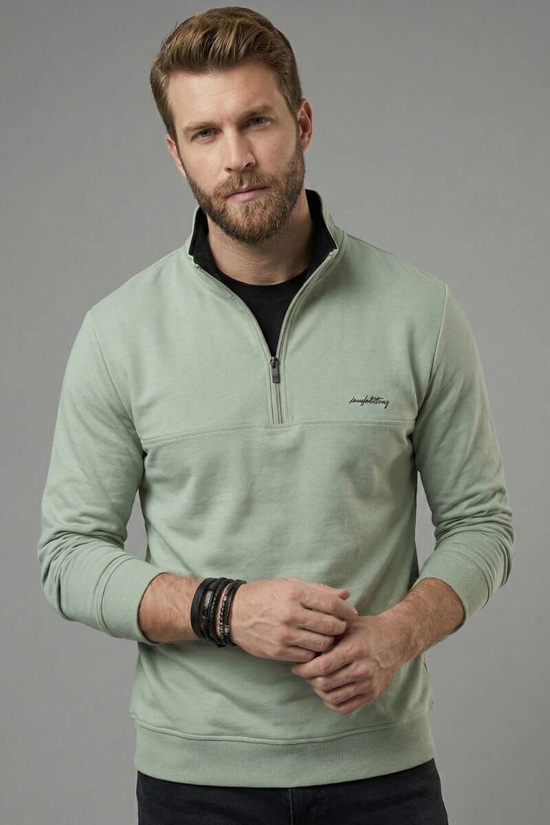 Yaka Fermuarlı İki İplik Erkek Sweatshirt Yeşil