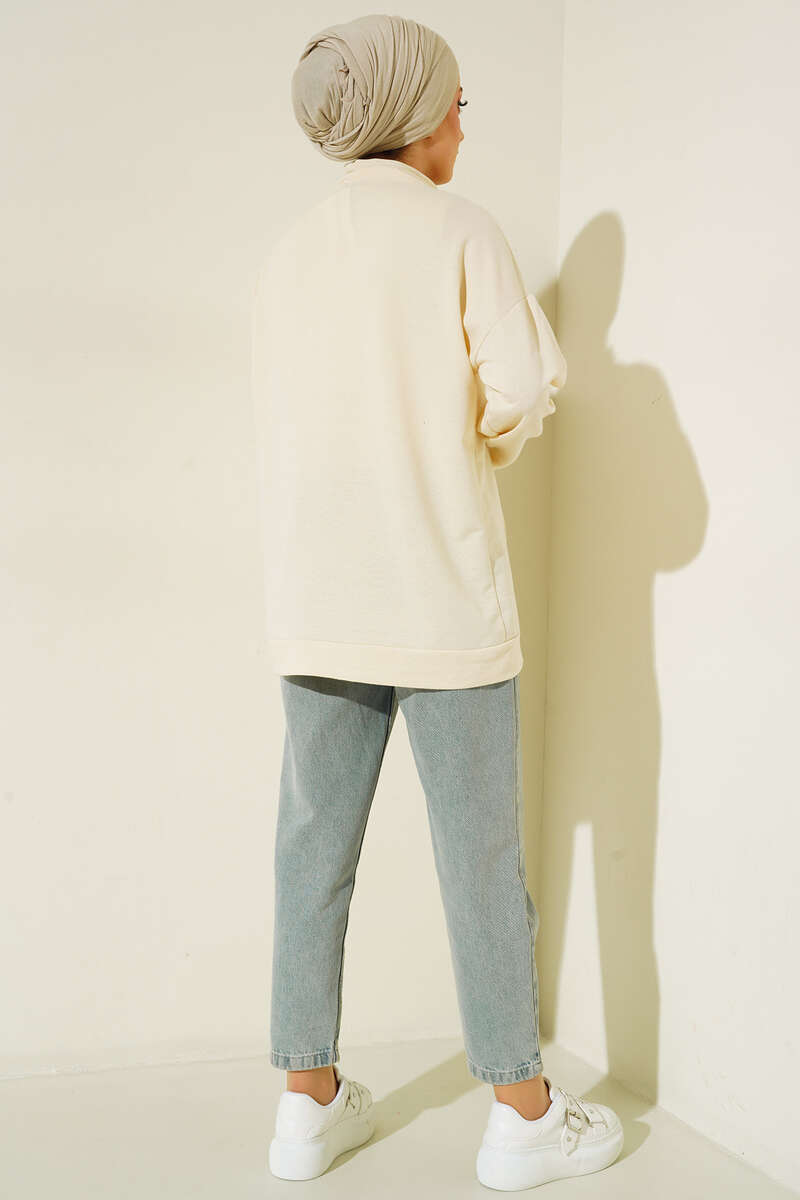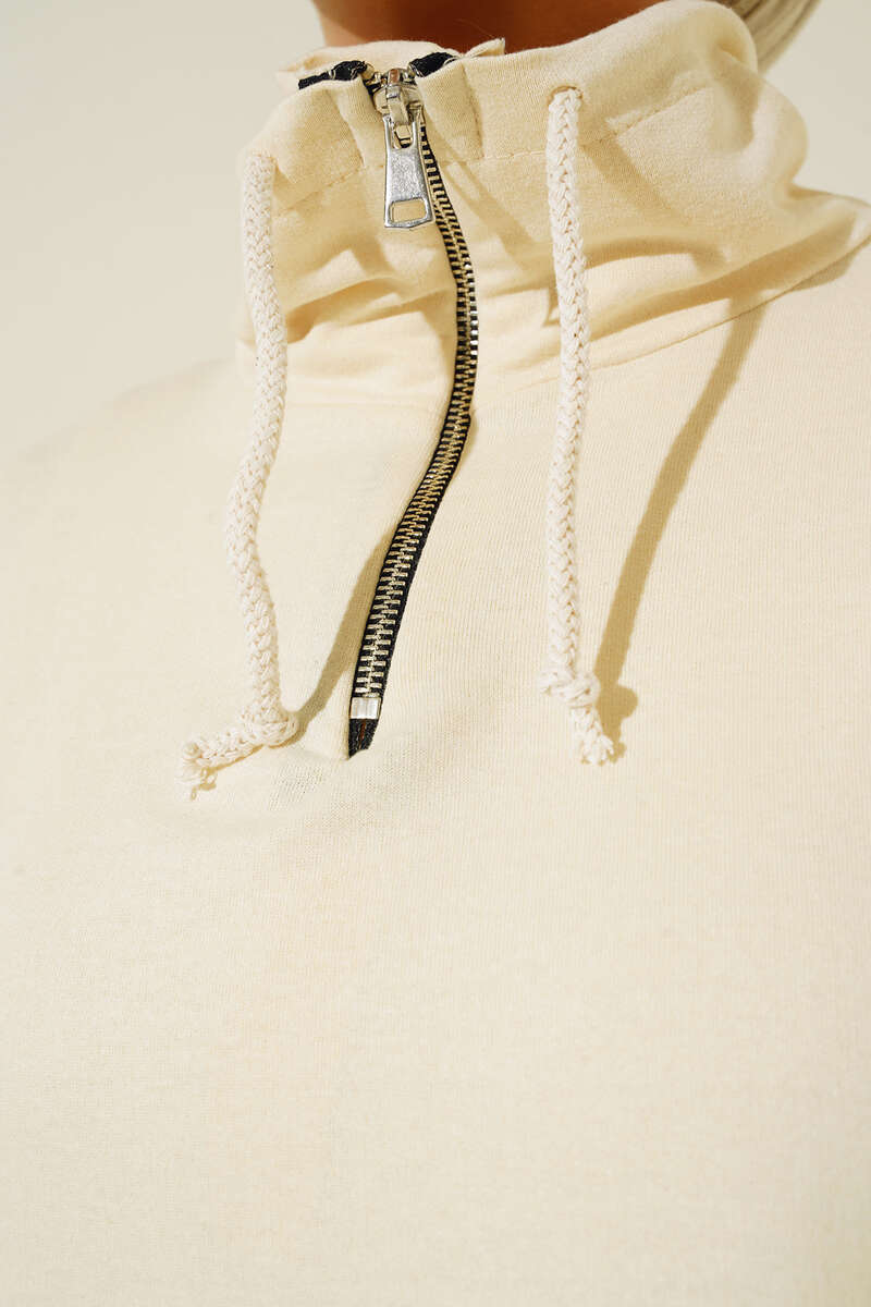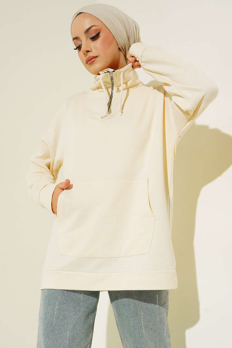 Yaka Fermuarlı Kanguru Cepli Tunik Bej