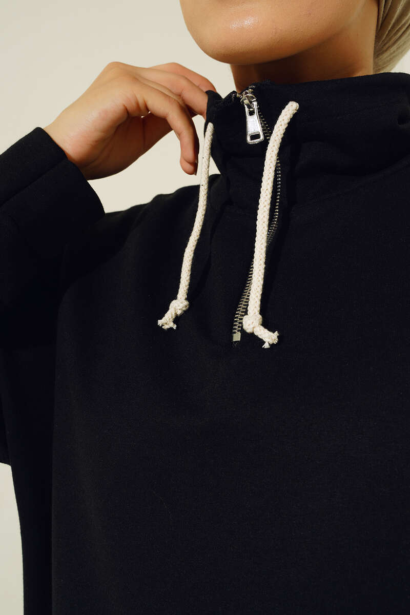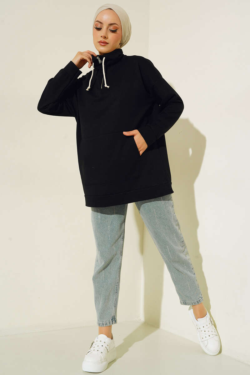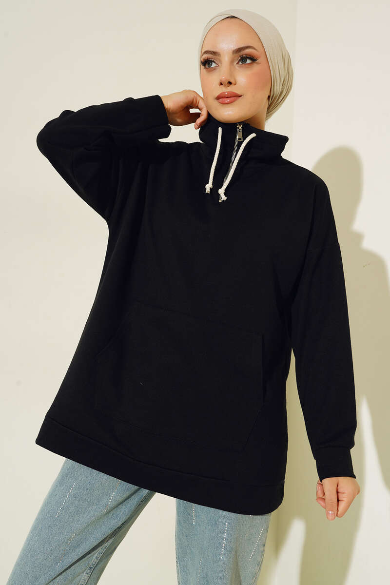 Yeni sezon tuniğimizin yakası fermuarlıdır. Dik yaka olan tuniğimizin ykası ip bağlamalıdır. Düşük omu zmodel olan tuniğimizin önünde bulunan kanguru cebi sportif bir görünüm kazanmıştır.
