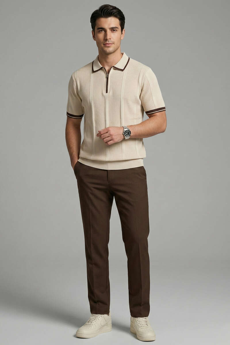 Polo Yaka Düğmeli Örme Erkek T-shirt Krem