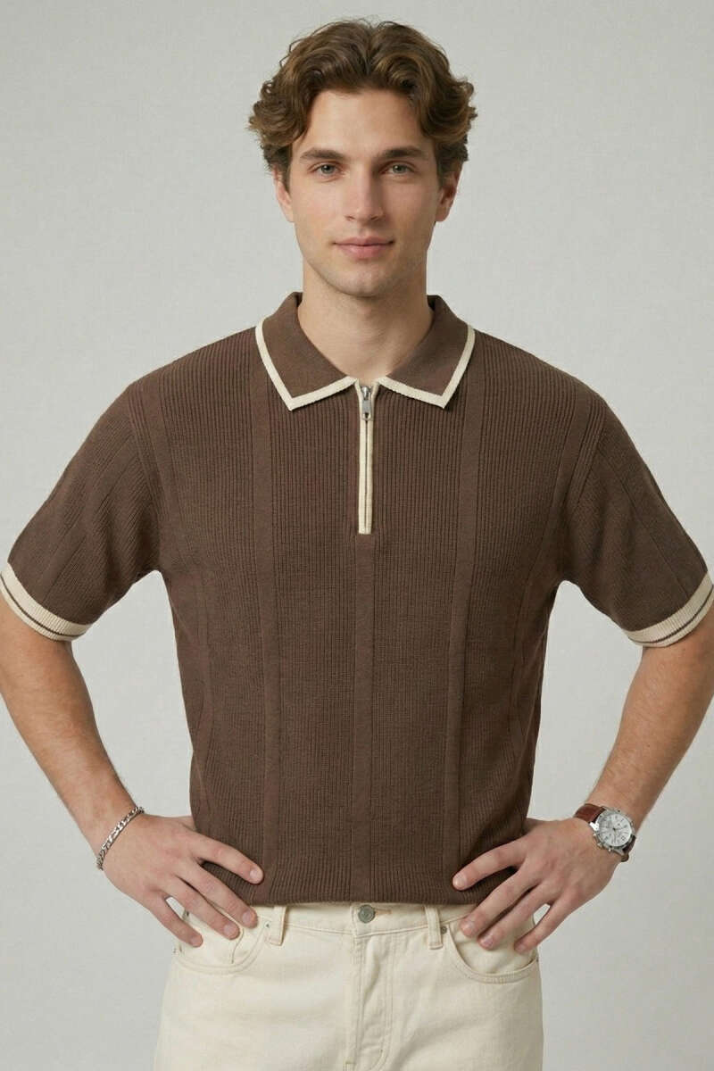 Yarım Patlı Erkek Triko T-shirt Bej