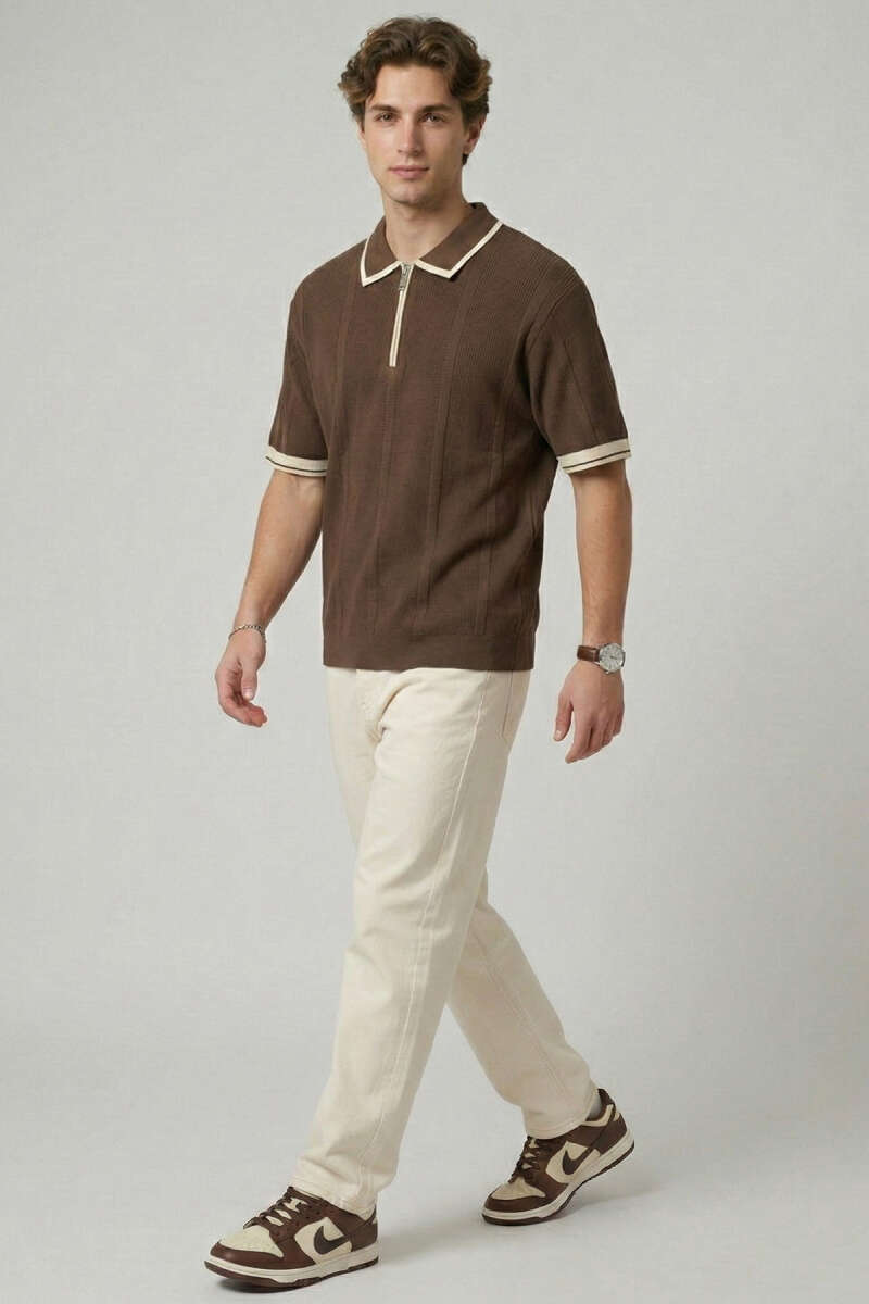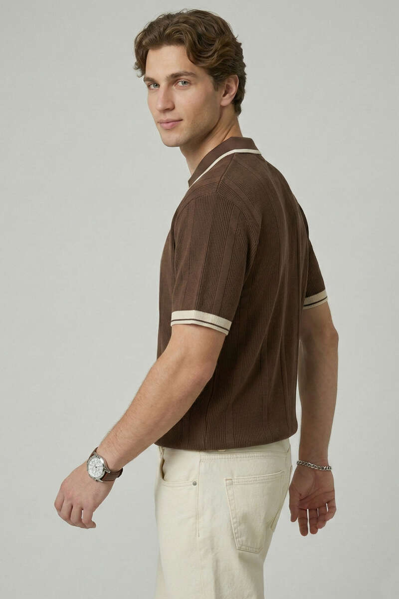 Polo Yaka Düğmeli Örme Erkek T-shirt Krem