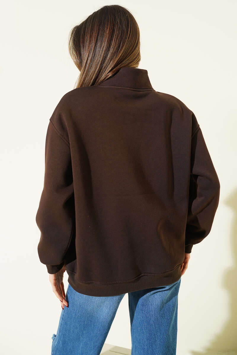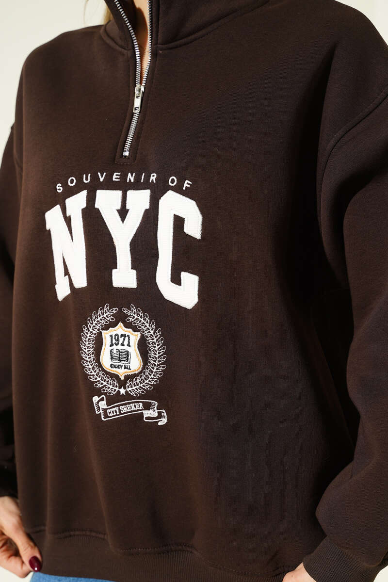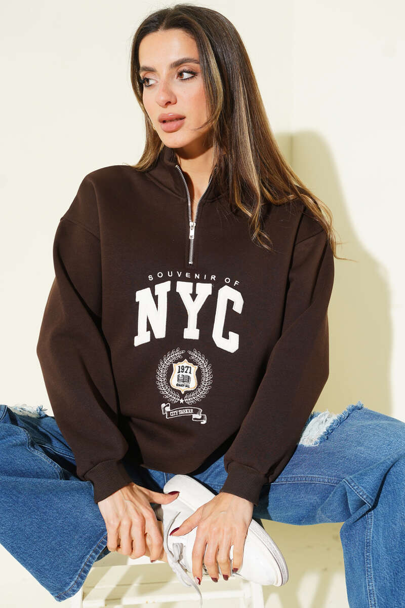 Yaka Fermuarlı Nyc Baskılı Sweatshirt Ekru