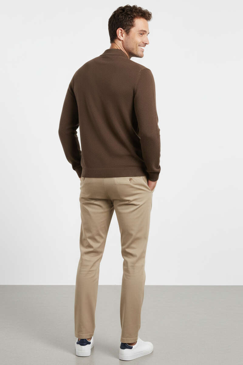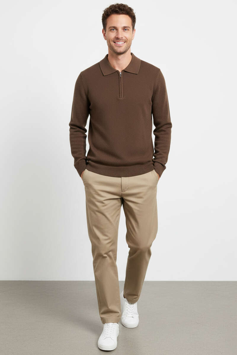 Yaka Fermuarlı Triko Erkek Kazak Kahve